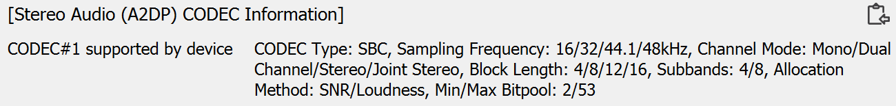Кодек всего один — SBC, верхний порог параметра Bitpool ограничен значением 52, что соответствует профилю High Quality с битрейтом вплоть до 345 Кбит/с — для трансляции музыки из стриминговых сервисов этого может быть вполне достаточно.