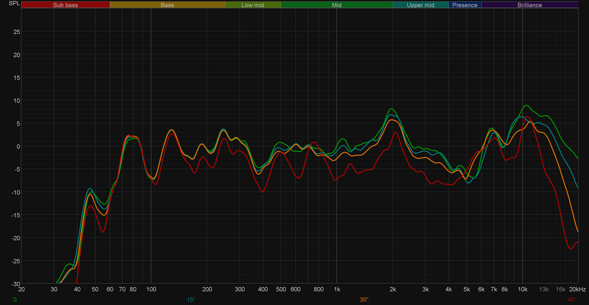 С горизонтальной дисперсией звука всё в целом неплохо — хотя при повороте колонок примерно на 45° уже становятся заметны неприятные «провалы» в среднечастотном диапазоне. Небольшую акустику всё же стоит хотя бы пытаться направлять непосредственно на слушателя — тут ничего нового.