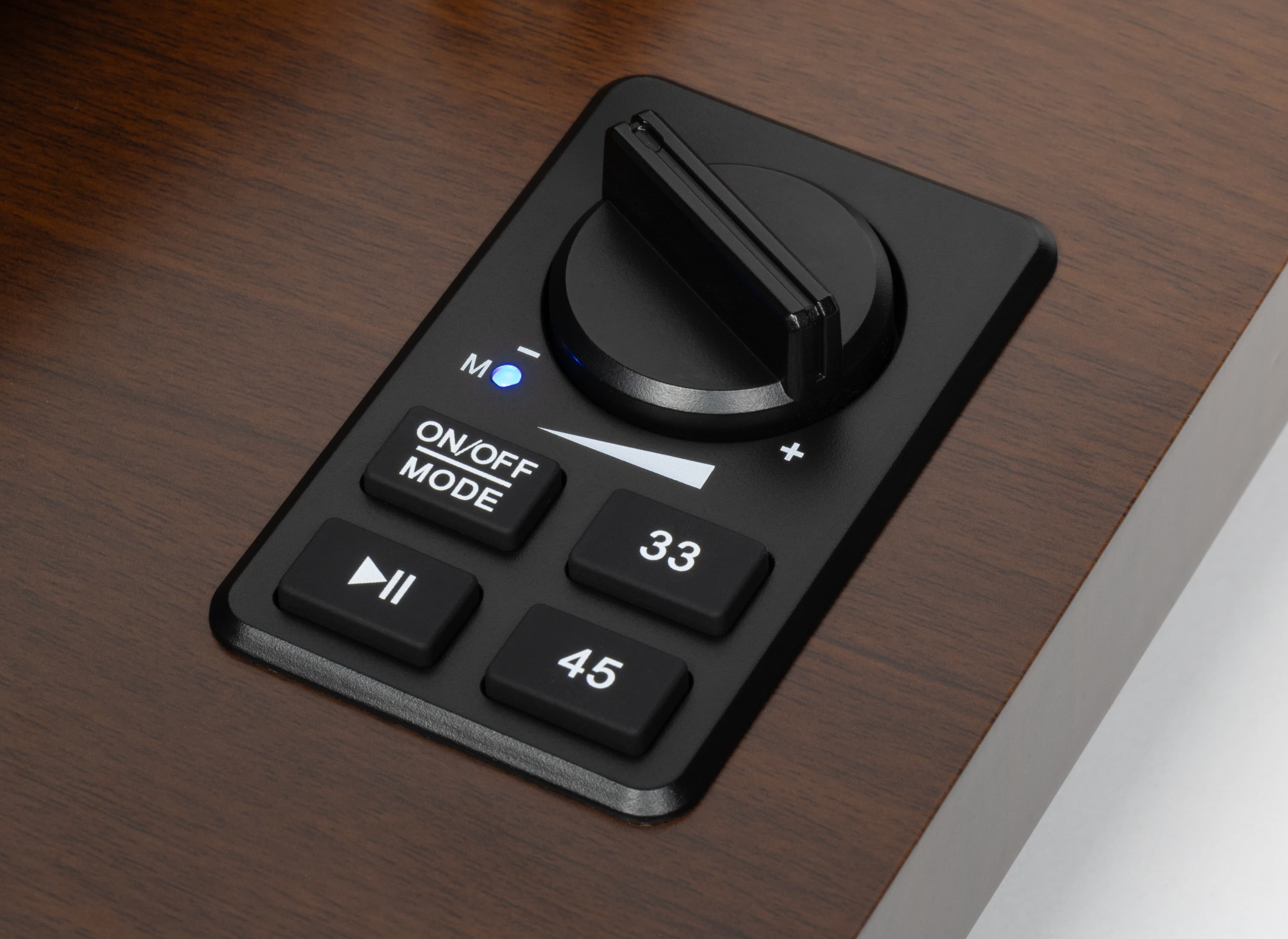 Небольшая панель управления расположена в правой части стола, выше нее виднеется рычаг подъема и опускания тонарма. В верхней части панели размещена ручка управления громкостью, ниже видны четыре кнопки. Две справа отвечают за выбор скорости вращения диска, кнопка «On/Off — Mode» при длительном нажатии включает питание, а при коротком осуществляет переключение между режимом воспроизведения винила и Bluetooth-подключением.