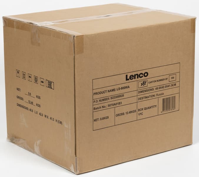 Проигрыватель приехал к нам сразу в двух коробках. Одна транспортировочная — из неокрашенного картона с черными надписями.