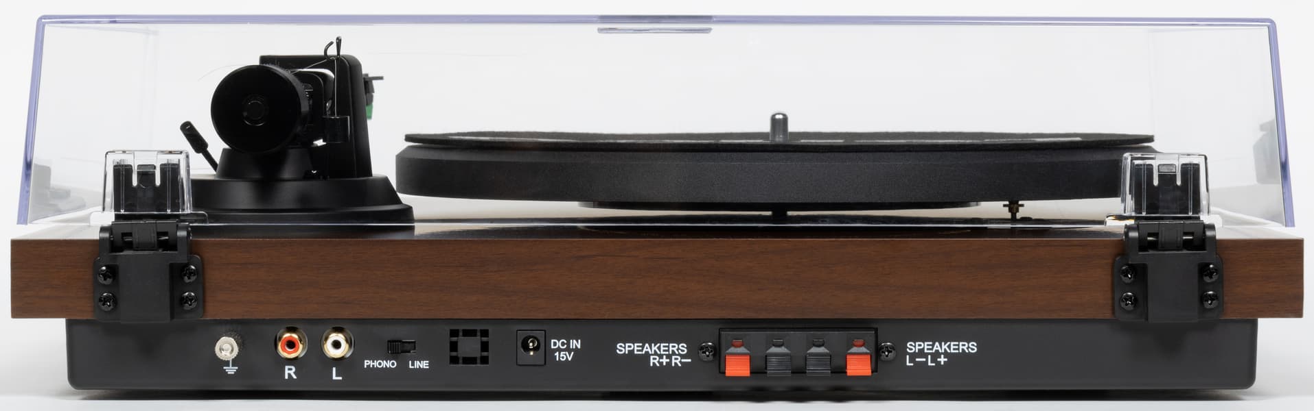 На задней панели расположены разъемы для подключения. Выход RCA может работать в режимах Line или Phono — для подключения к усилителю или фонокорректору соответственно. В последнем случае понадобится крепление для клеммы заземления, которое также имеется. Далее мы видим разъем питания, а сразу за ним — клеммы для кабелей, соединяющих основное устройство с колонками.