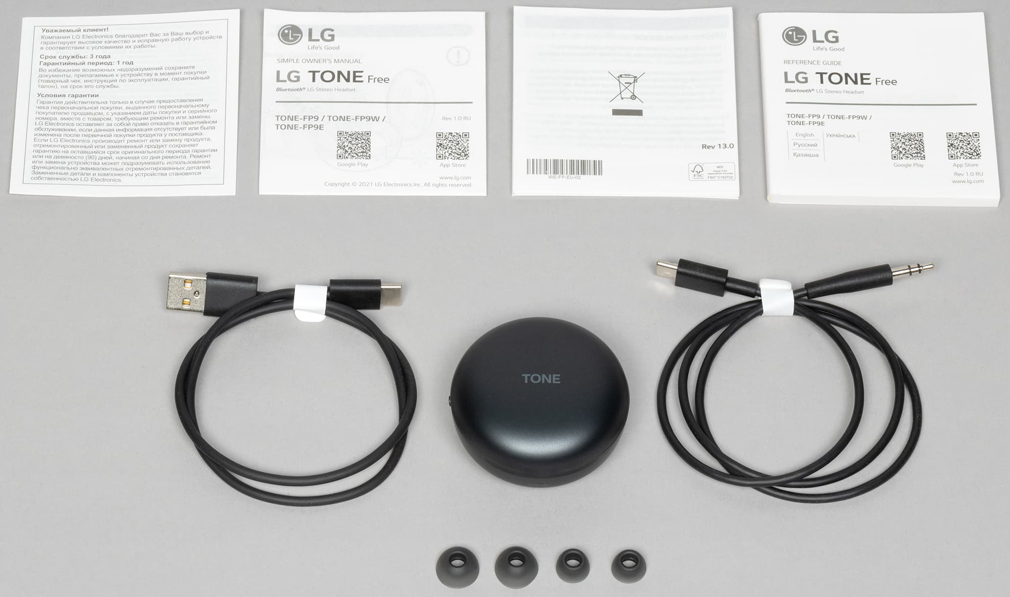 В комплект поставки входят кейс с наушниками, документация, кабель USB-A — USB-C для зарядки, кабель миниджек — USB-C для подключения футляра к источникам звука, комплект силиконовых насадок.
