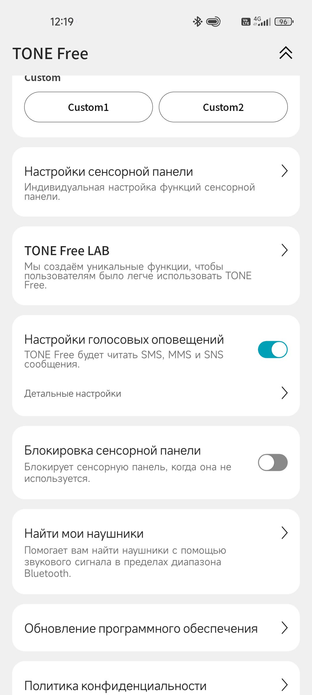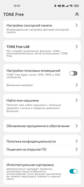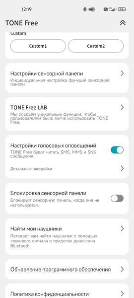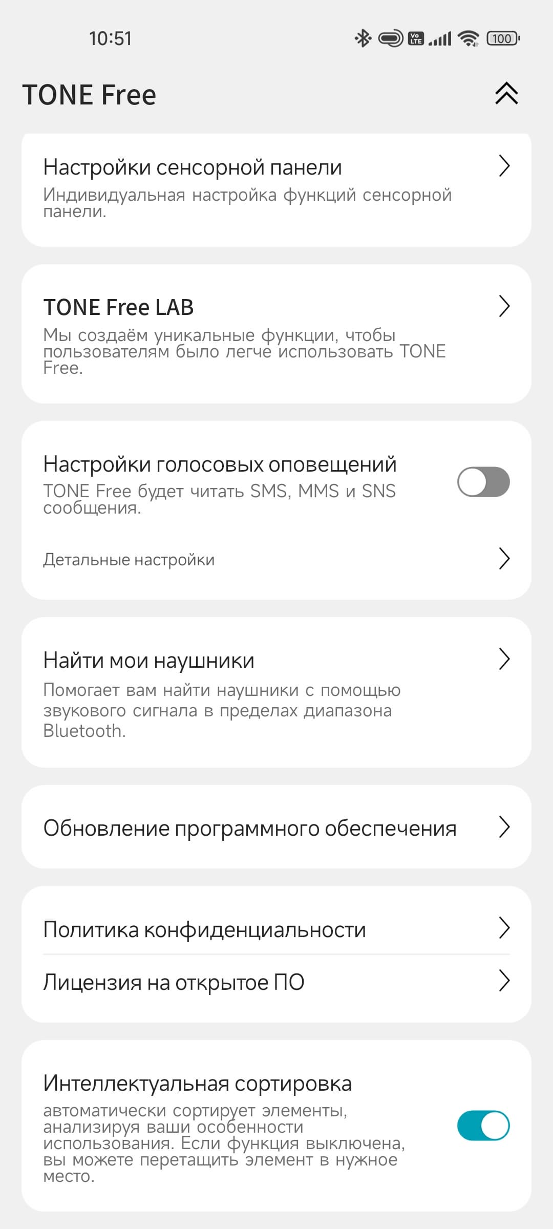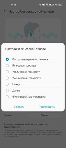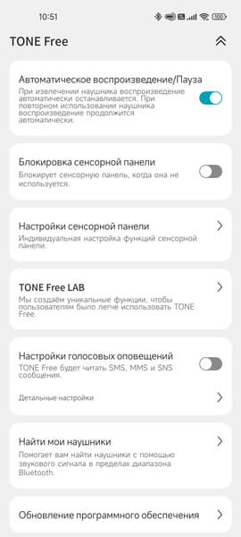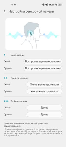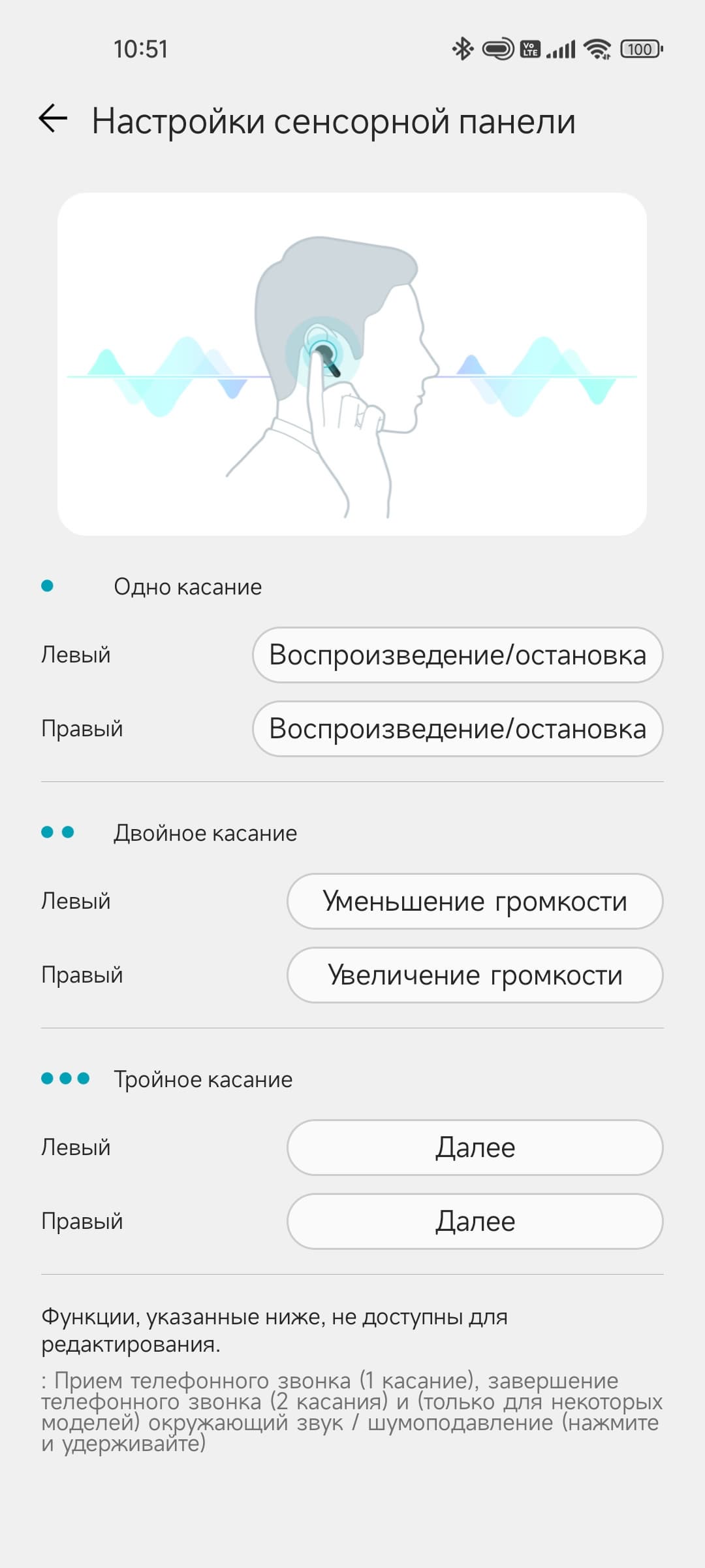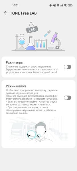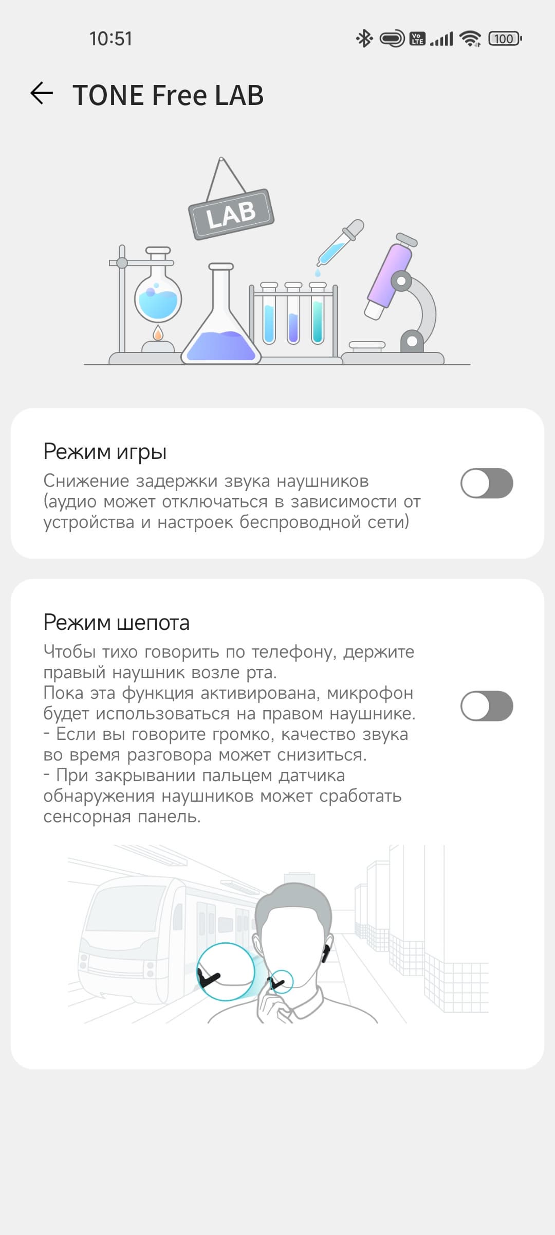 Профиль управления можно сменить и настроить под себя, в частности — «повесить» на один из поддерживаемых типов касания сенсора вызов голосового ассистента. В разделе «лаборатории» есть некий «игровой режим», проверить работу которого нам так и не удалось — задержки звука в играх не было и без него. Ну а еще есть режим шепота, позволяющий тихо говорить по телефону, держа правый наушник возле рта. А вот это действительно интересно, пару раз мы пробовали тихо поговорить в шумном помещении — вполне удавалось.