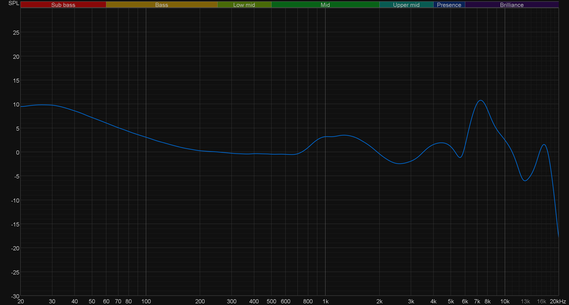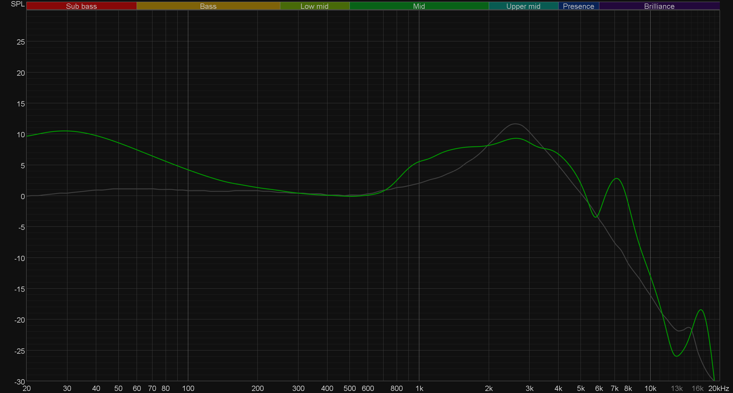 График выше показан на фоне кривой IDF (IEM diffuse field compensation), предоставленной производителем используемого стенда. Ее задача — помочь скомпенсировать резонансные явления в имитированном слуховом канале и особенности используемого оборудования, создав «звуковой профиль», максимально корректно иллюстрирующий то, как звучание наушников воспринимается слушателем. Ее можно рассматривать как адаптированный под конкретное устройство аналог так называемой «кривой Хармана», созданной командой Harman International под руководством доктора Шона Олива. Скомпенсируем полученный график АЧХ в соответствии с кривой IDF.