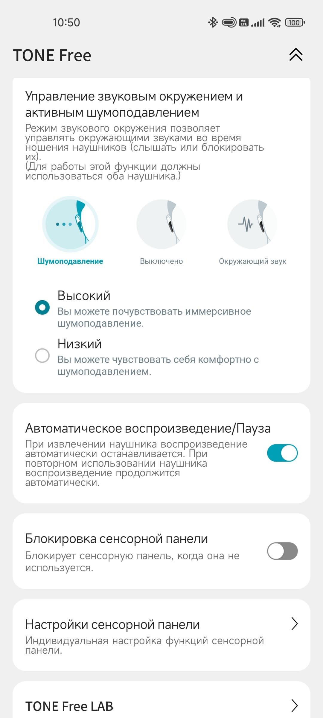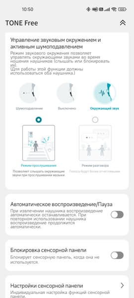 У функции окружающего звука тоже два режима: один позволяет слышать происходящее вокруг, а другой предназначен для того, чтобы общаться с собеседниками, не снимая наушники. В втором случае гарнитура заметно подчеркивает среднечастотный диапазон, делая речь более разборчивой — очень приятная и удобная опция. Там же можно включить и выключить функцию автопаузы, либо вообще заблокировать сенсорную панель.