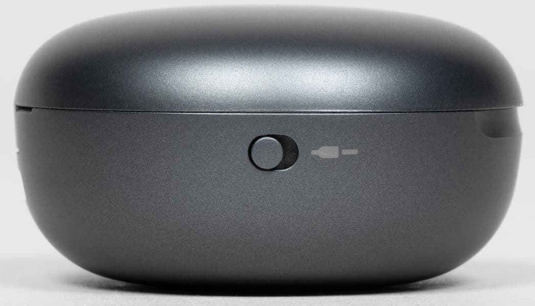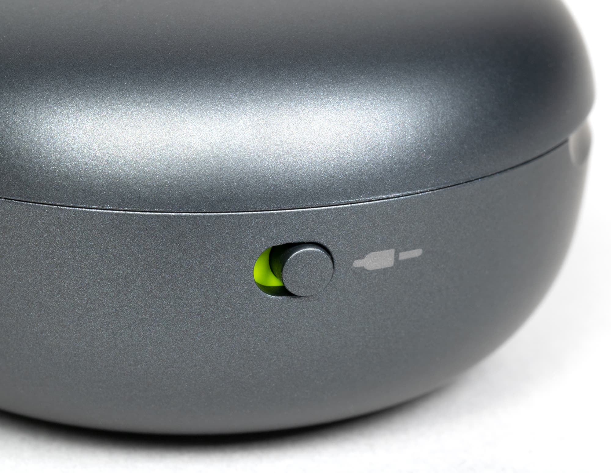 Внутри слотов для наушников видны по два светодиода. Один просто светит темно-синим светом и размещен там для красоты, заодно напоминая о присутствии функции обеззараживания с помощью УФ-излучения. А вот наличие второго, излучение которого направлено внутрь силиконовых насадок, внешне почти не заметно. Но вот как раз он-то и делает всю работу. В углублениях для «палочек» наушников видны подпружиненные контакты для зарядки.