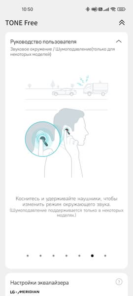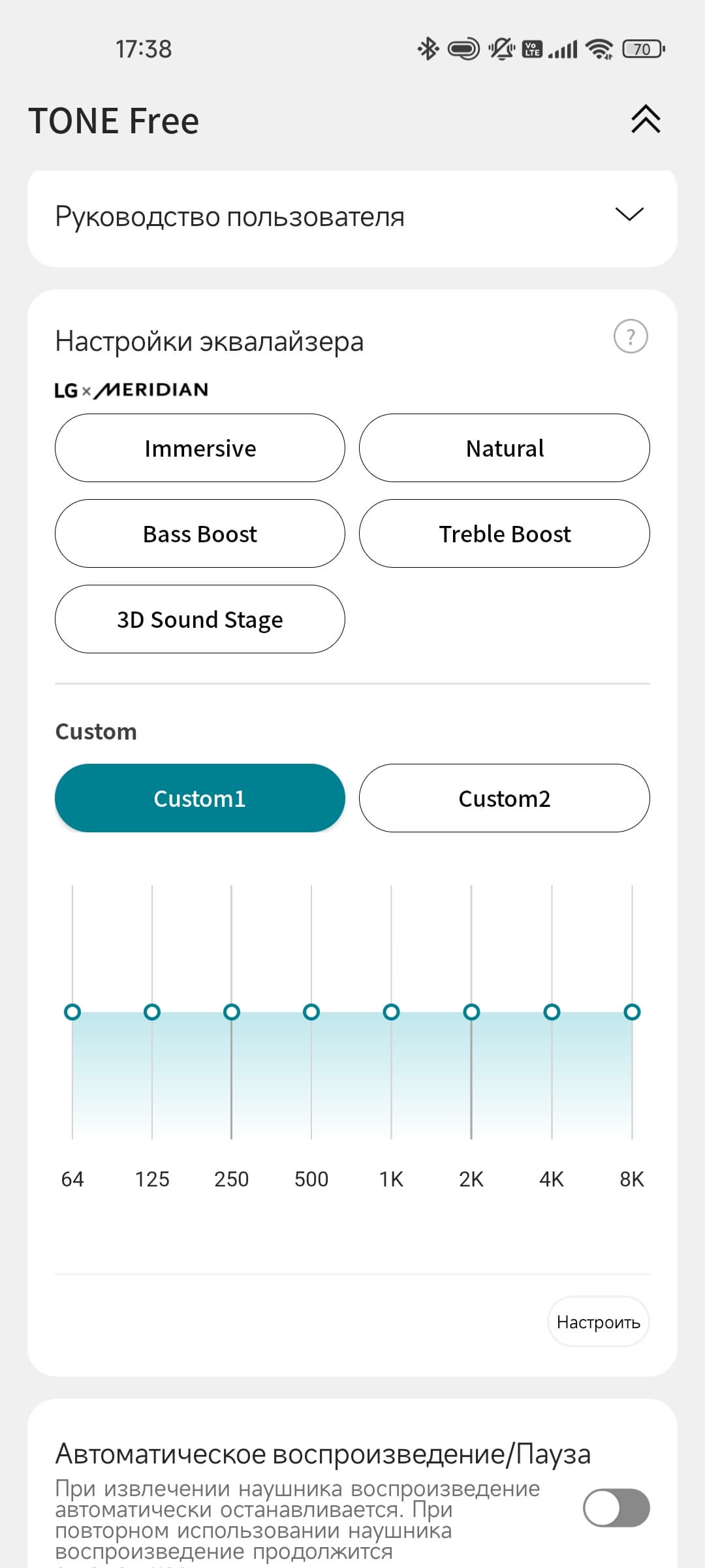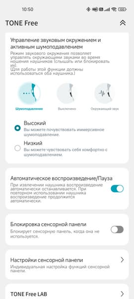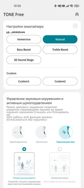 Ну а мы переходим непосредственно в приложение. Первое, что нас там интересует — это, конечно, эквалайзер. Есть несколько пресетов, плюс возможность создавать свои с помощью 8 полос, позволяющих очень неплохо адаптировать звучание под свой вкус. Далее, конечно, управление активным шумоподавлением — тут стоит обратить внимание на два режима его работы. Названы они «высокий» и «низкий», но тут сказываются трудности перевода, речь идет про более высокую и низкую активность работы.