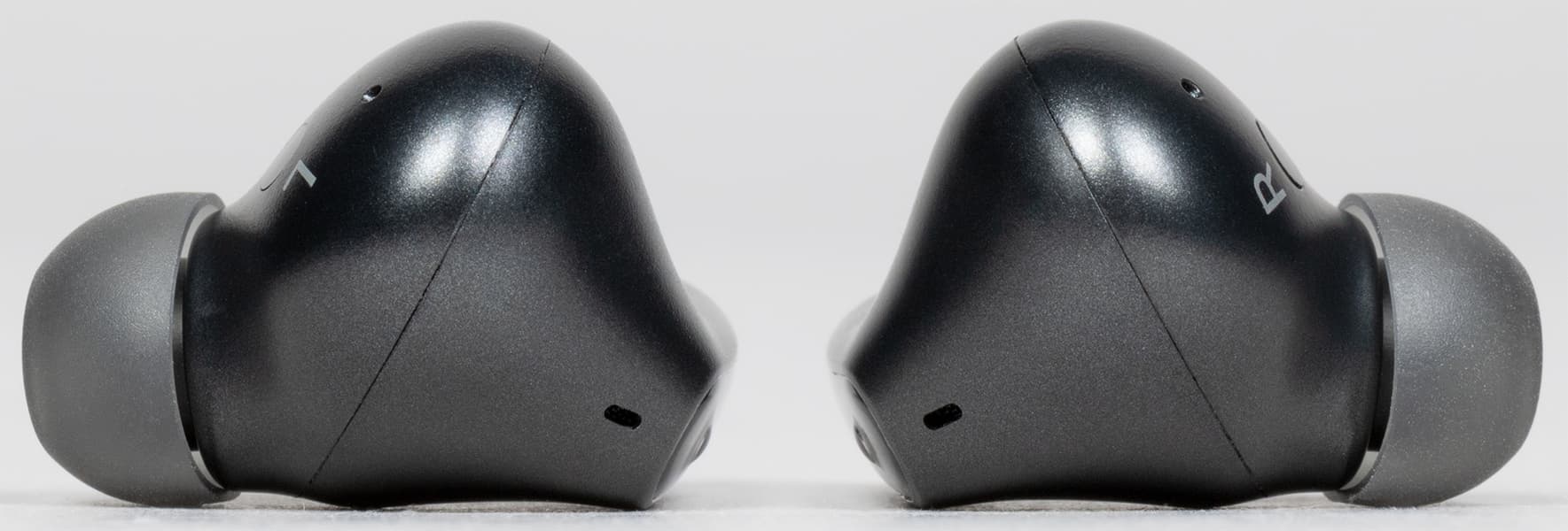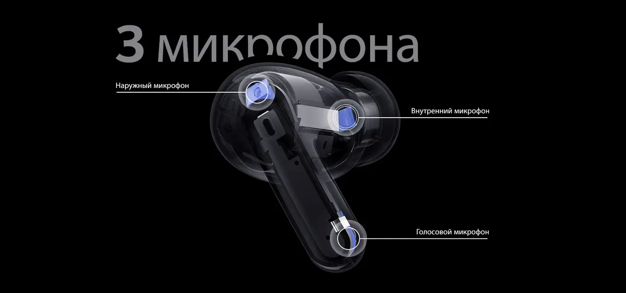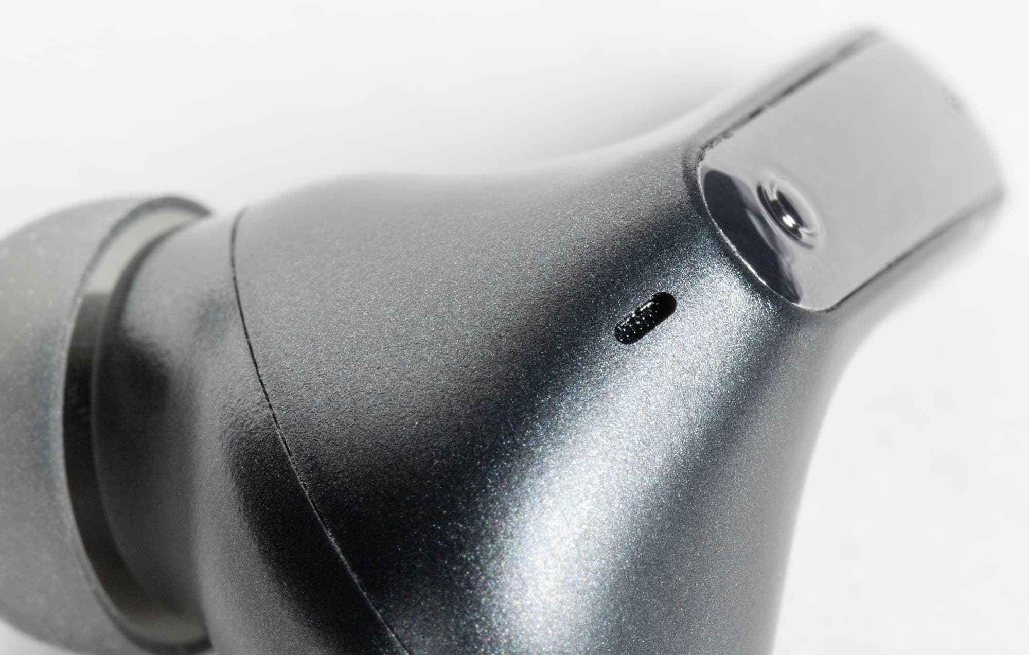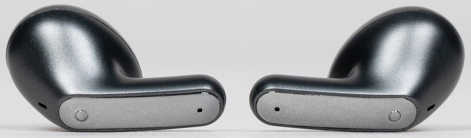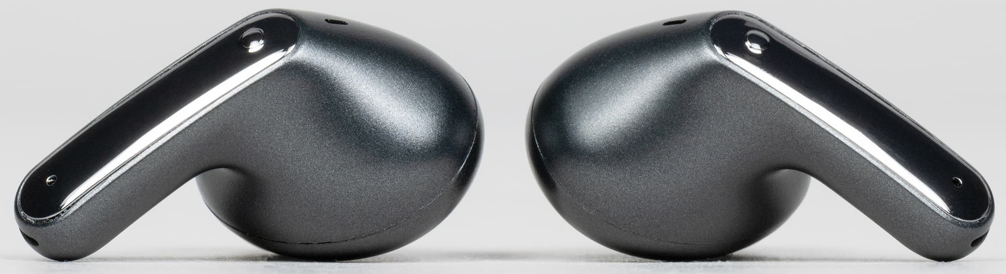 В нижней части «ножки» и на верхней поверхности округлого элемента наушников видны отверстия микрофонов. Первый служит для голосовой связи, второй — обеспечивает работу активного шумоподавления.