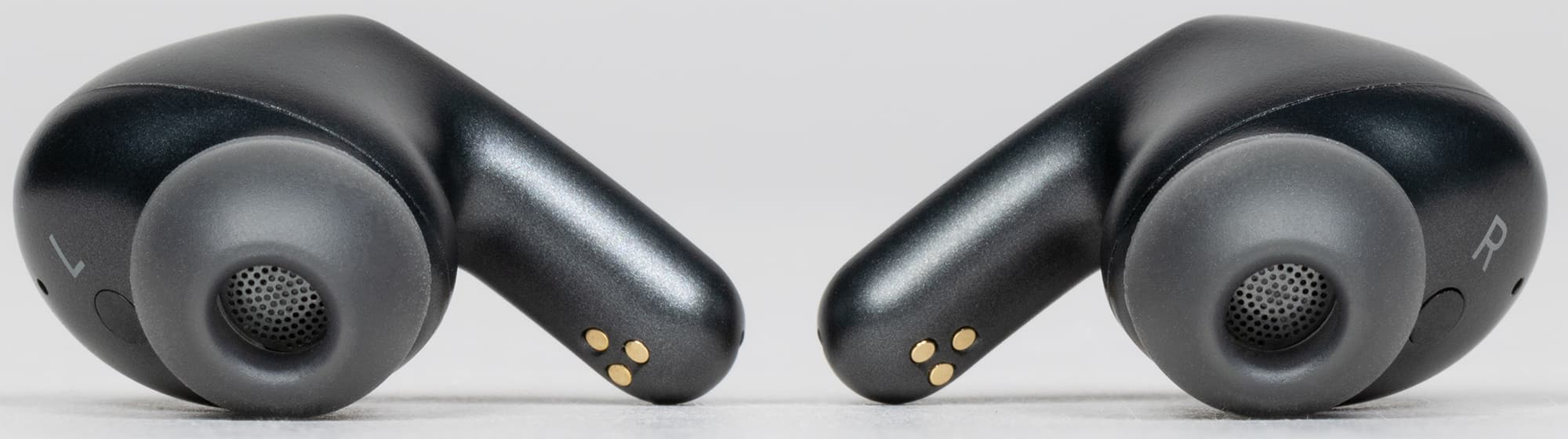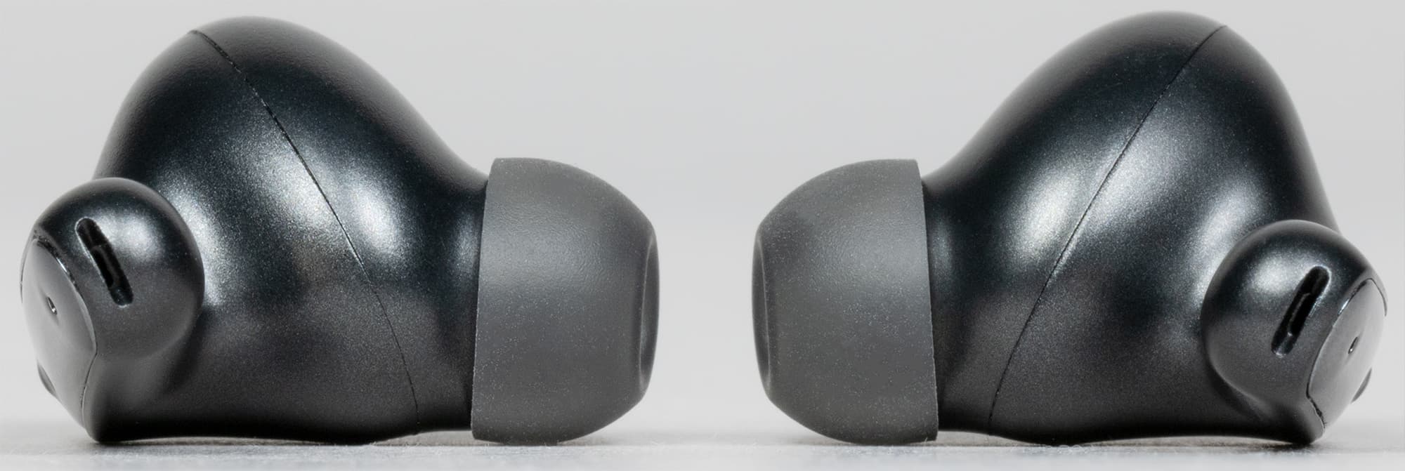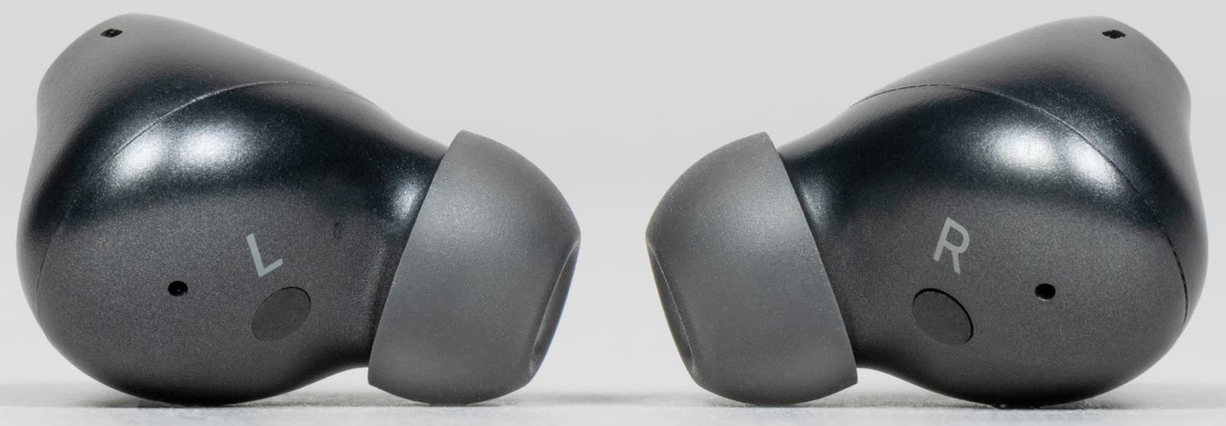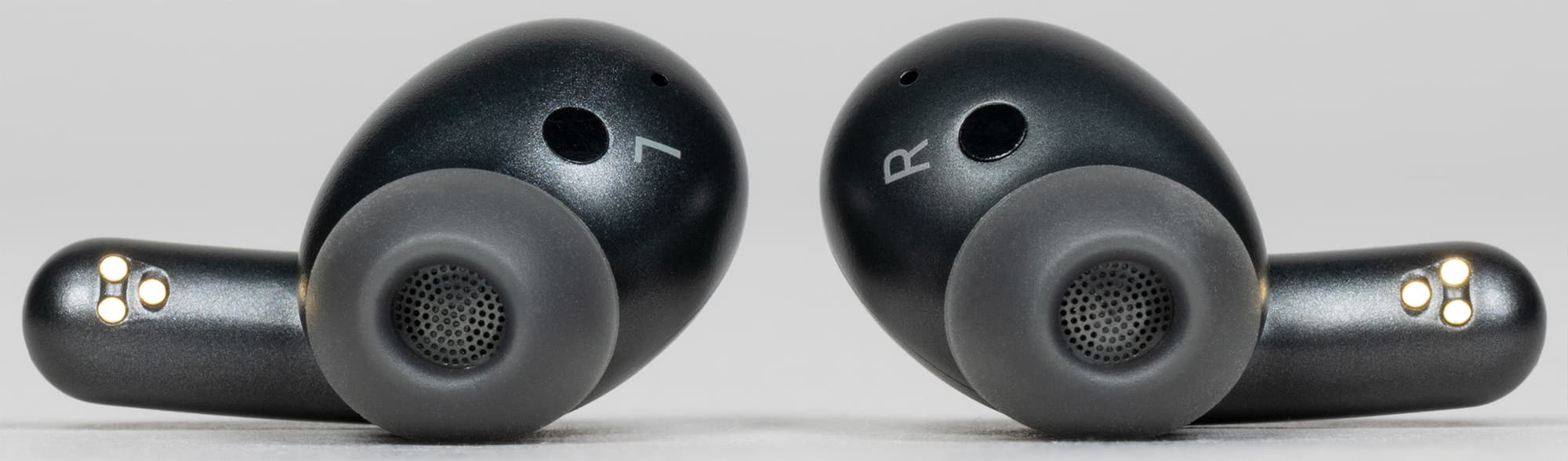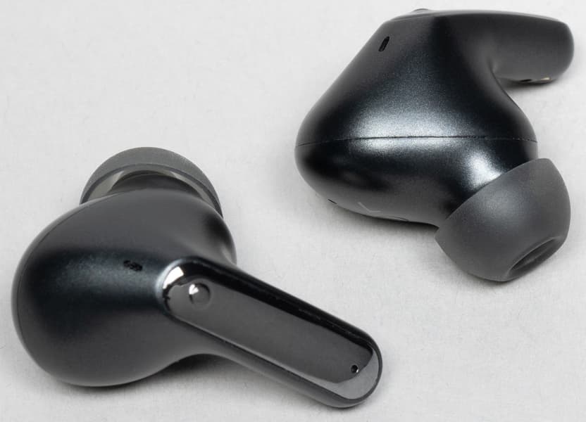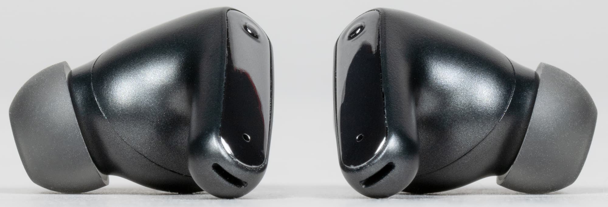 В нижней части «ножки» и на верхней поверхности округлого элемента наушников видны отверстия микрофонов. Первый служит для голосовой связи, второй — обеспечивает работу активного шумоподавления.
