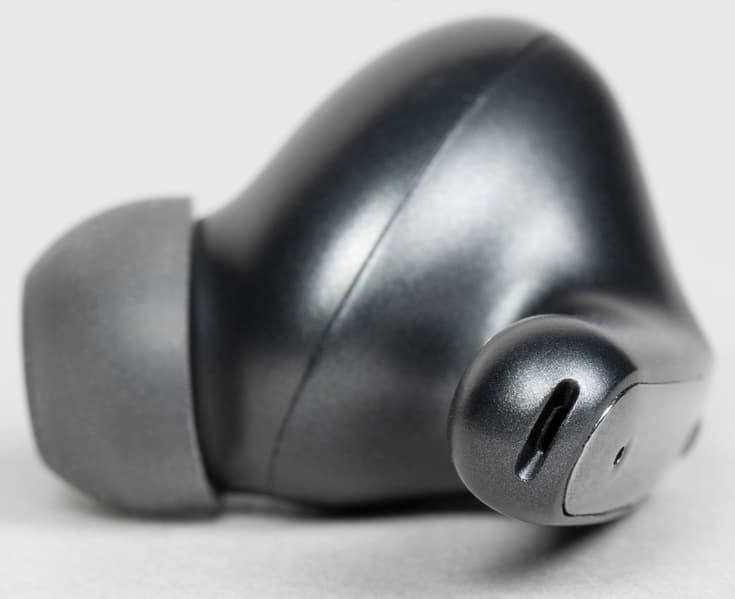 Звуковод выходит из корпуса чуть под углом, но при этом имеет далеко не самую большую длину и не рассчитан на глубокое погружение в слуховой проход.