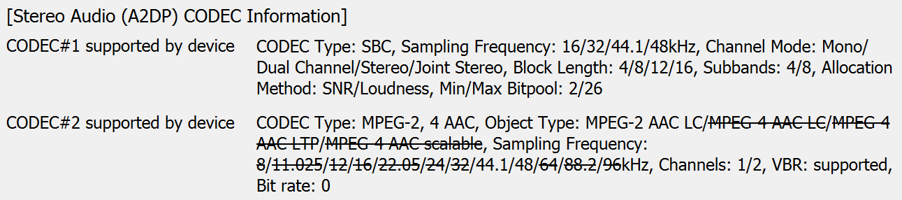 Заодно с помощью утилиты Bluetooth Tweaker был получен список поддерживаемых кодеков и их режимов. Кодеков снова два: базовый SBC, плюс несколько более «продвинутый» AAC. Хотелось бы, конечно, увидеть еще и aptX. Но с другой стороны, возможности AAC тоже не стоит недооценивать, равно как и усилия специалистов из Meridian — звучит гарнитура как минимум интересно.
