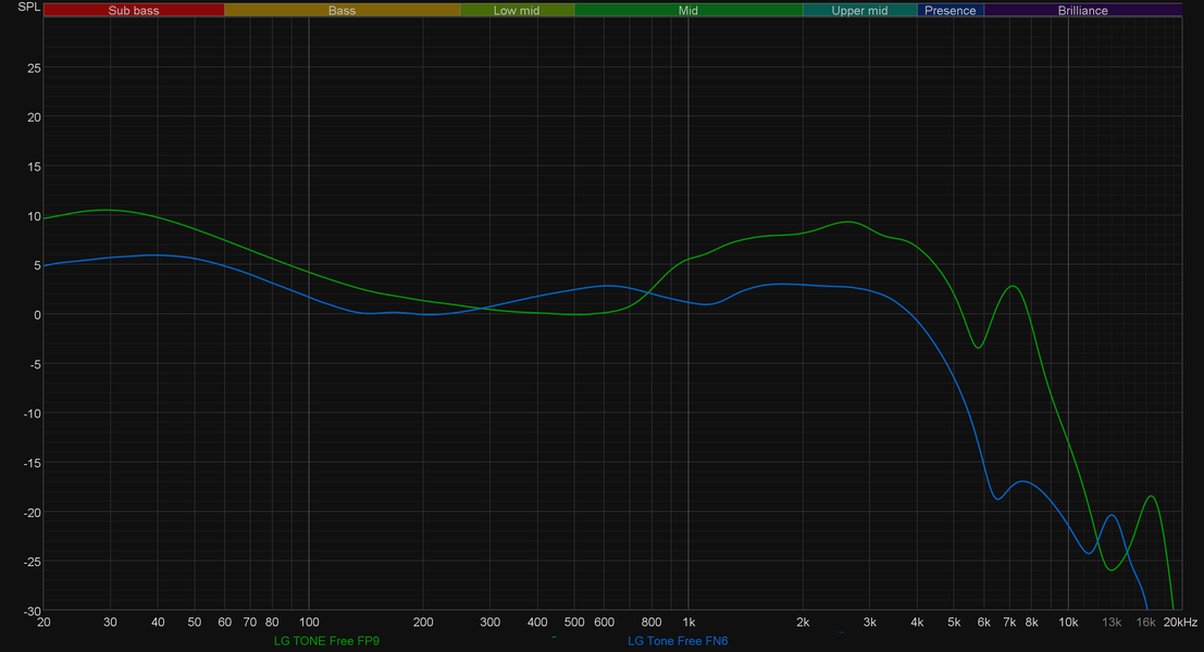 Ну и, конечно, под конец мы не могли не сравнить графики АЧХ новой LG Tone Free FP9 и уже знакомой нам Free HBS-FN6. Производитель анонсировал увеличение эффективной площади мембраны динамика на 75,5% — к чему это привело, можно увидеть ниже. Субъективно звучание новинки нам понравилось ощутимо больше, но тут дело вкуса, конечно.