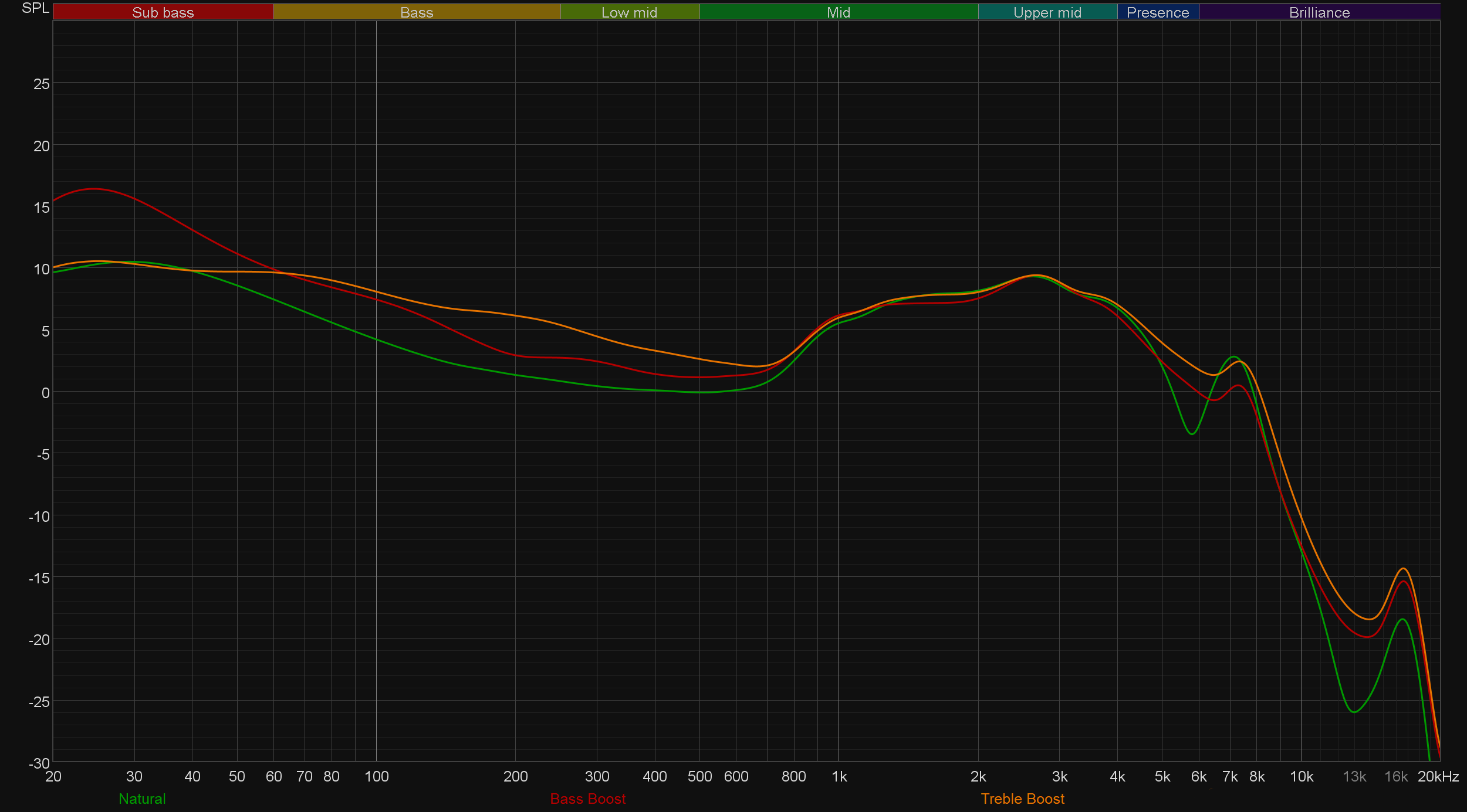 В таком виде она максимально полно иллюстрирует сказанное выше — виден и подчеркнутый бас, и небольшой «горб» в среднечастотном диапазоне. Ну а к изрезанности графика в области высоких частот традиционно не следует относиться слишком серьезно. Встроенный в приложение эквалайзер позволяет заметно подстроить звук под свой вкус. Посмотрим на графики, полученные при активации предустановленных пресетов — они работают ровно так, как можно предположить по их названиям.