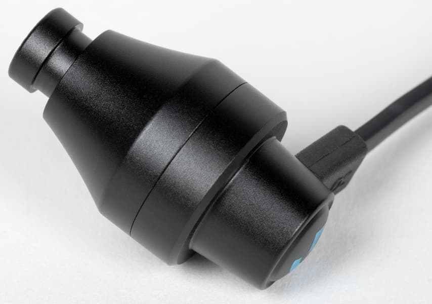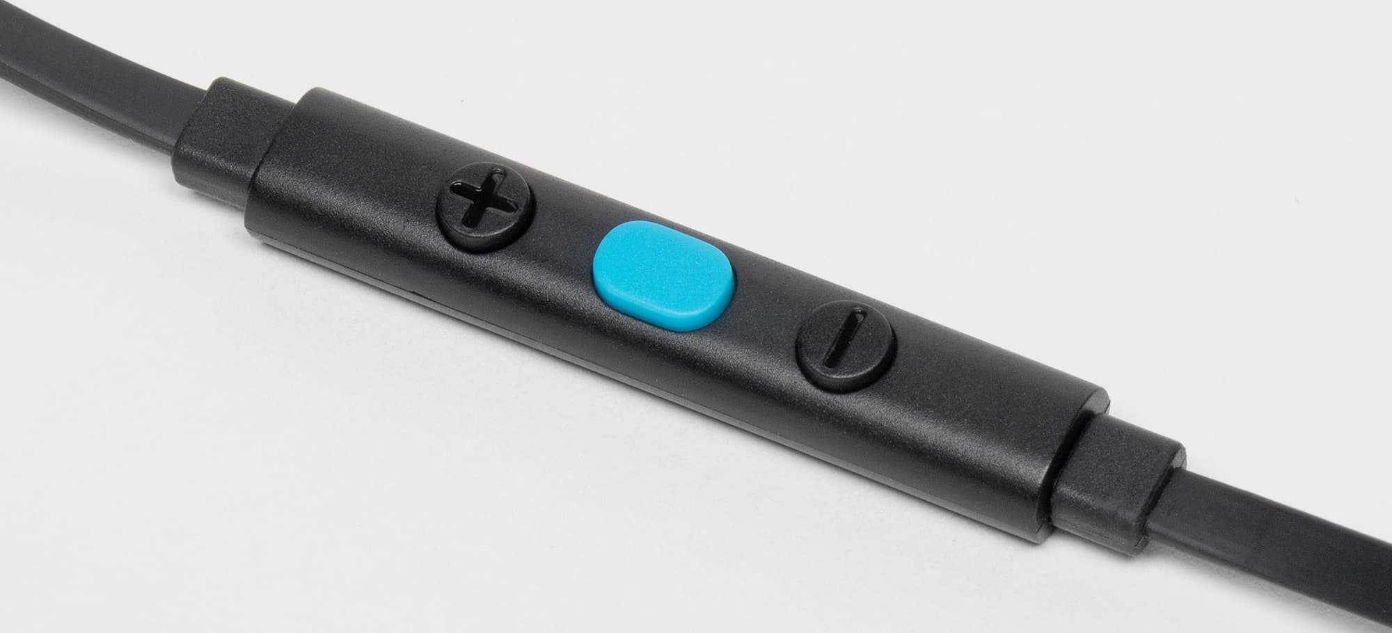 Пульт управления расположен на кабеле, ведущем к правому наушнику. На задней его части размещено отверстие микрофона, на передней — кнопки. Всего их три, центральная выделена цветом. Все они нажимаются мягко и с очень приятным кликом, после нескольких часов ношения гарнитуры привыкаешь пользоваться им на ощупь — становится совсем удобно.