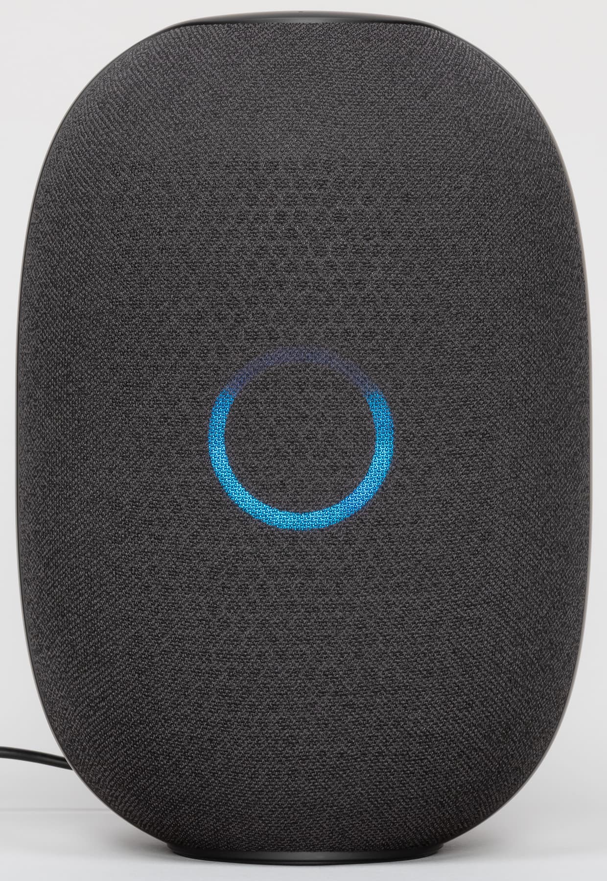 Динамики не видны, под тканью едва различима лишь защищающая их решетка, но из описания производителя мы знаем, что внутри находятся высокочастотный драйвер мощностью 5 Вт, низкочастотный на 25 Вт и один пассивный излучатель диаметром 82 мм. Отключение микрофона происходит на аппаратном уровне: кнопка рядом с разъемом питания «утапливается» в корпус с ощутимым щелчком.