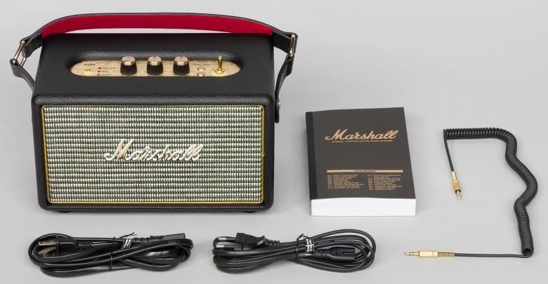В комплекте есть все необходимое для использования устройства. Особо стоит отметить качество упаковки и размещения элементов комплекта внутри коробки. Под крышкой счастливого обладателя новинки ждет красиво расположенный аудиокабель, книжка и вкладыш с кабелями питания. Marshall Kilburn относится к разряду тех товаров, которые создают приятное впечатление прямо с момента вскрытия упаковки.