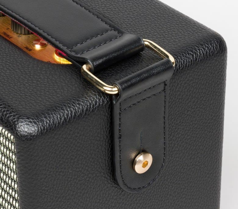 На правой и левой гранях колонки присутствуют металлические ушки, к которым крепится ремень для переноски. Похожие элементы встречаются на некоторых моделях гитарных стреплоков (приспособлений для надежной фиксации гитарного ремня).