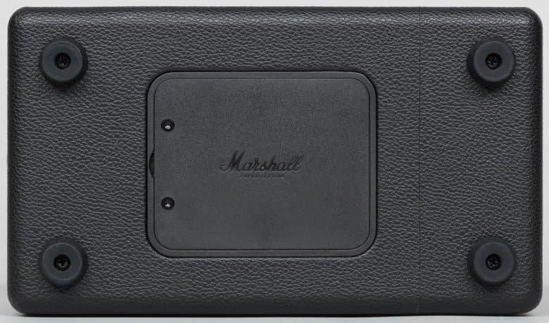 На тыльной стороне находится выход фазоинвертора и вход для кабеля питания. Блок питания у колонки встроенный. Задняя крышка является самым заметным отличием Marshall Kilburn от гитарных усилителей, имеющих, как правило, широкое окно в задней стенке.