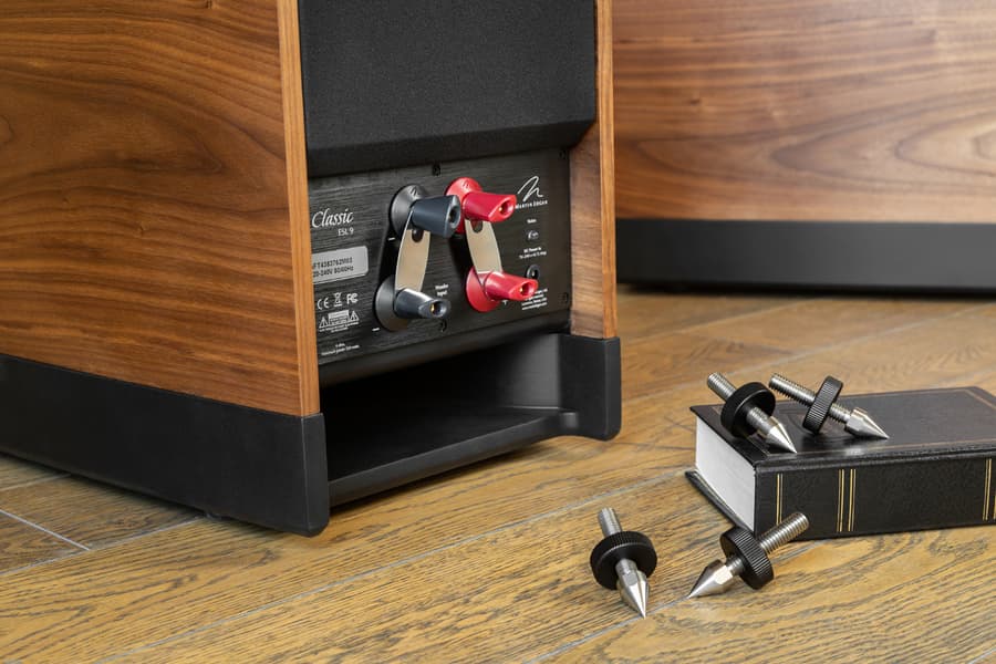 Подключение колонок осуществляется с помощью уже упомянутых выше зажимных клемм, а также разъемов Banana или Spade. По умолчанию на парах клемм стоят перемычки, сняв которые можно реализовать подключение bi-wiring или bi-amping — раздельно подключить к усилителю электростатические панели и сабвуферы. Акустика пассивная, но внешнее питание ей все же нужно для подачи напряжения на статоры, которое обеспечивает электростатическое взаимодействие между ними и мембраной. Разъем находится справа от клемм, блоки питания идут в комплекте. По умолчанию колонки размещаются на небольших ножках, но при желании их можно заменить на шипы — тут уж все зависит от покрытия пола и предпочтений слушателя.