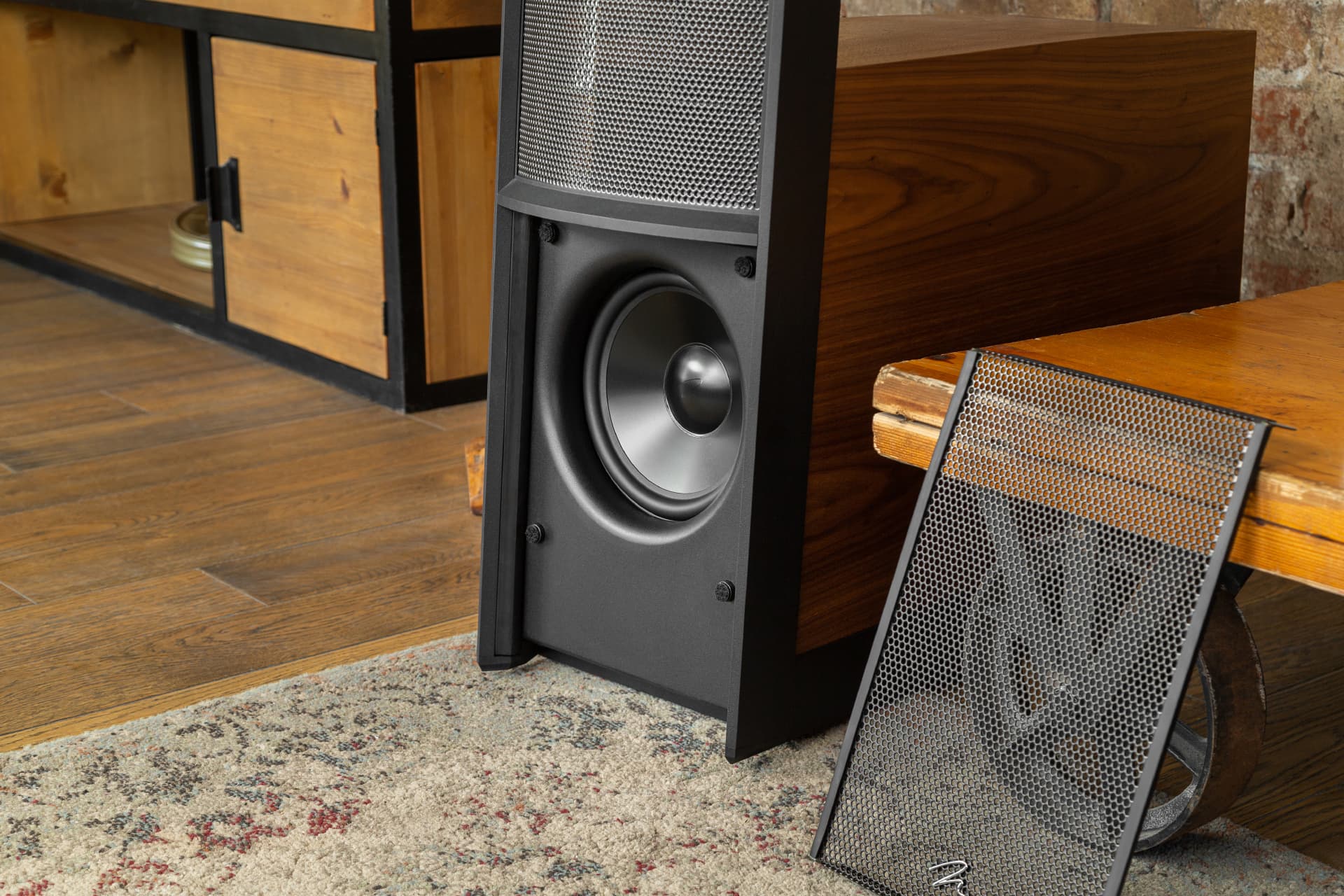 На иллюстрации выше хорошо заметны динамические излучатели, обеспечивающие воспроизведение низкочастотного диапазона — о них и поговорим. На самом деле, их два в каждой колонке: один направлен вперед, другой — назад. Причем размещены они не зеркально, а на разных осях — таким образом снижаются вибрация и «гудение» корпуса в диапазоне от 34 до 100 Гц. Снижаются, но совсем не исчезают — это мы подробно обсудим ниже.
