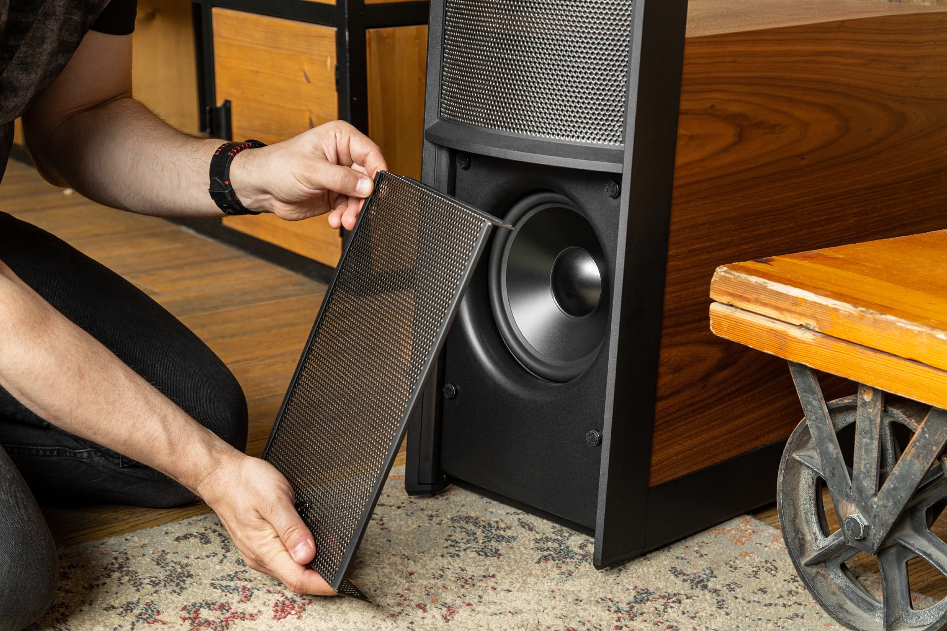 Грили удерживаются с помощью магнитов и легко снимаются. Без них колонки выглядят немного эффектнее. Так что, если нет опасности повреждения динамика чьими-нибудь маленькими пальцами или лапами с когтями — их есть смысл убрать.