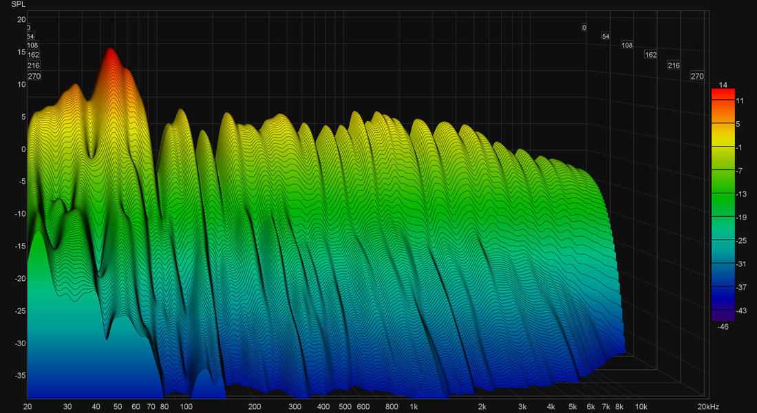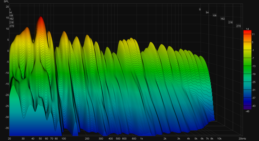Для тех, кто захочет ознакомиться с «водопадом» в этой точке, чтобы сделать собственные выводы — приведем и его. Но в очередной раз напомним, что графики — это только иллюстрации, пусть и весьма информативные. Акустику непременно надо слушать, тем более — такую. То, что не понравилось глазам, вполне может понравиться ушам.