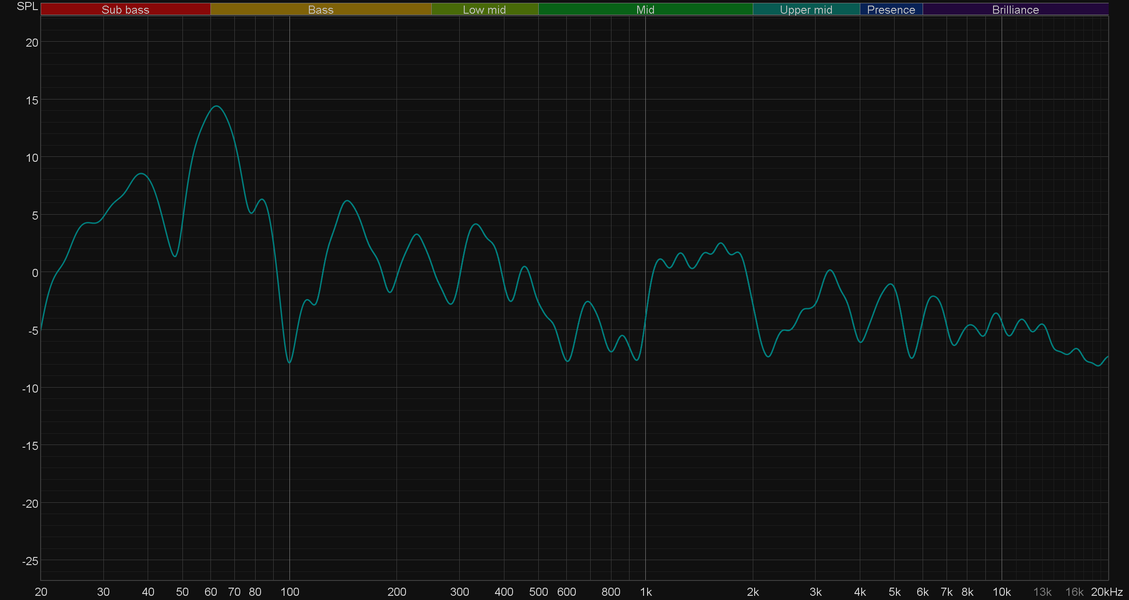 Ну и нельзя не отметить, что многие нюансы звучания акустики компенсируются или наоборот усиливаются их положением. Ради интереса мы отошли подальше от колонок — так, чтобы «заиграла» стоящая в комнате мебель, различные отражающие и поглощающие звук поверхности, ну и так далее. График получился не очень красивый, зато очень показательный — видно, что АЧХ изменилась разительно.