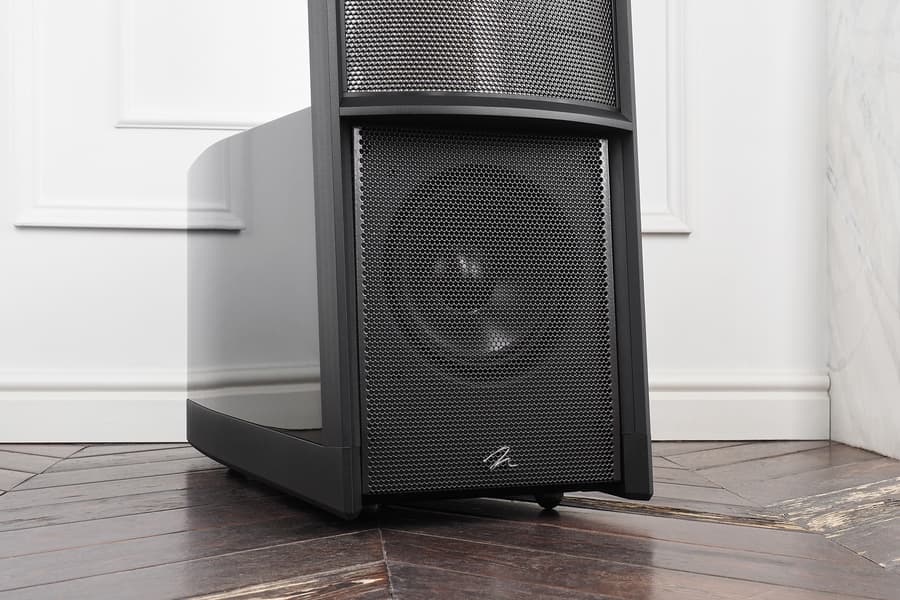 В нижней части колонок размещены низкочастотные динамики. И вот тут нас ждет много всего интересного. Начнем с того, что динамика два. Первый смотрит на слушателя и закрыт съемной металлической решеткой с логотипом производителя.