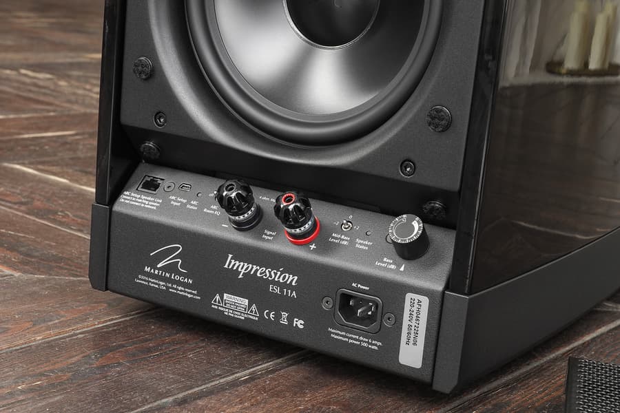 Также на панели расположены два регулятора, являющихся одной из важнейших отличительных черт Martin Logan Impression ESL 11A. Поворотная ручка справа позволяет регулировать частоты ниже примерно 75 Гц, а выключатель левее добавляет или убирает акцент на мидбасе в районе 200 Гц. Вместе они позволяют подстроить звучание акустики как под помещение, так и под вкусы слушателя.