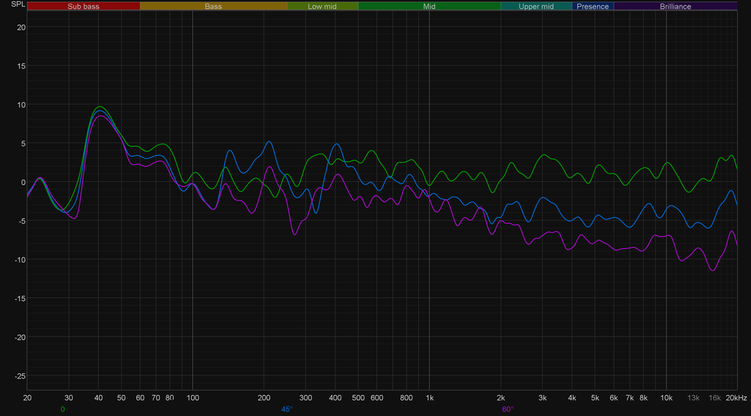 Ну и в конце традиционно продемонстрируем, что горизонтальная дисперсия у «электростатов» не очень велика — стоит сдвинуть микрофон в сторону, как качество передачи среднечастотного диапазона резко падает. Потому к их размещению стоит подойти со всей ответственностью.