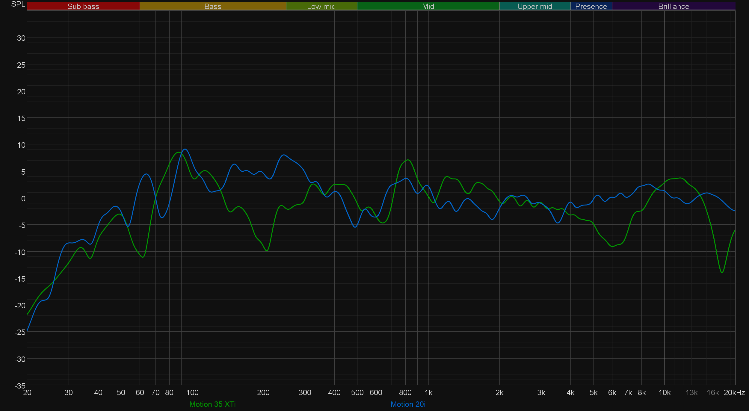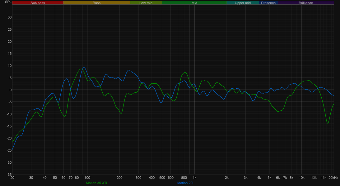 В целом же акустика звучит очень и очень интересно — намного более впечатляюще, чем можно было бы ожидать от довольно компактного полочного решения. Ради интереса сравним два графика: тестируемых Logan Motion 35 XTi и младших напольных колонок из той же серии — Motion 20i. Дополнительно комментировать полученную картинку не будем — каждый волен делать из нее выводы сам.