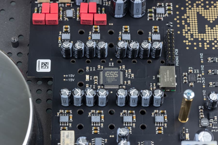 Микросхема ЦАП ESS Technologies — это старший и самый дорогой продукт американского производителя, ES9038Pro с рекордными параметрами качества. Динамический диапазон может составлять до 140 дБ. Сам чип имеет 8 выходов, но может работать в режиме суперстерео, то есть не просто dual mono, а quad mono. При этом суммирование сигналов с 8 внутренних ЦАП в два стереоканала производится внутри самой микросхемы. Вероятно, такое «внутреннее» суммирование не так эффектно выглядит — уже нельзя продемонстрировать ненормальное количество чипов на огромной печатной плате, — но зато хорошо сказывается на звучании. Чип ES9038Pro довольно сложный, он имеет встроенный мощный микропроцессор, который занимается расчетом интерполирующих фильтров на очень высоких частотах. Поэтому для работы он требует отдельный генератор 100 МГц, который можно видеть справа на плате. По причине сложности начинки один только чип ЦАП ES9038Pro стоит дороже, чем все 4 микросхемы цифровых процессоров внутри Manhattan DAC II, поэтому мы уделяем ему столько внимания в описании.