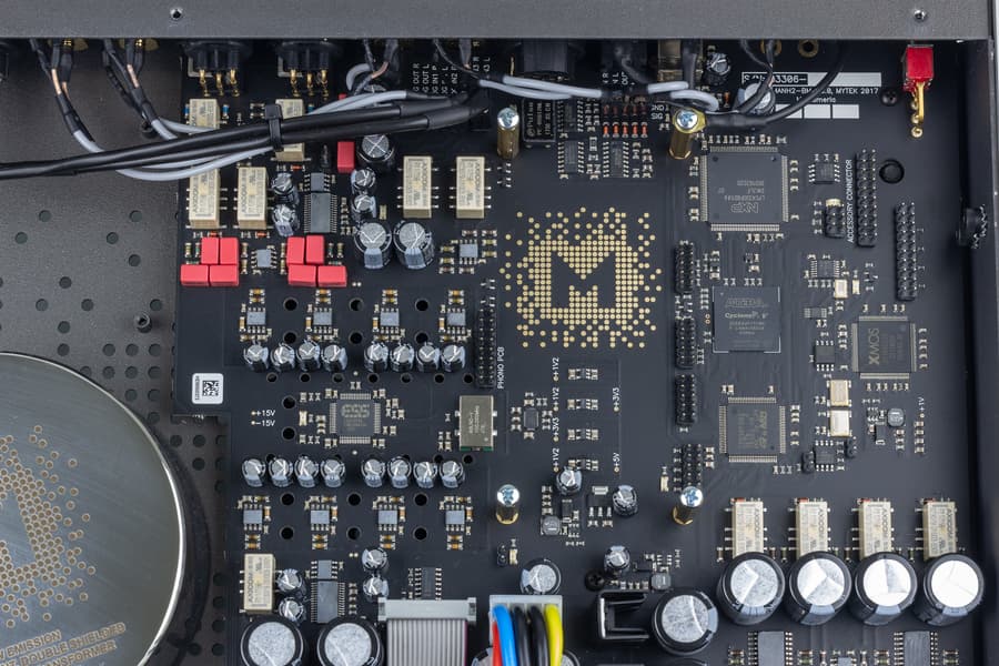 Внутренняя начинка брендовой техники всегда интересна. Большие габариты корпуса позволили с комфортом разместить все модули и удалить их друг от друга во избежание наводок, а также запитать отдельным питанием. Разъемы подключения соединены с основной платой качественными проводами большого сечения.