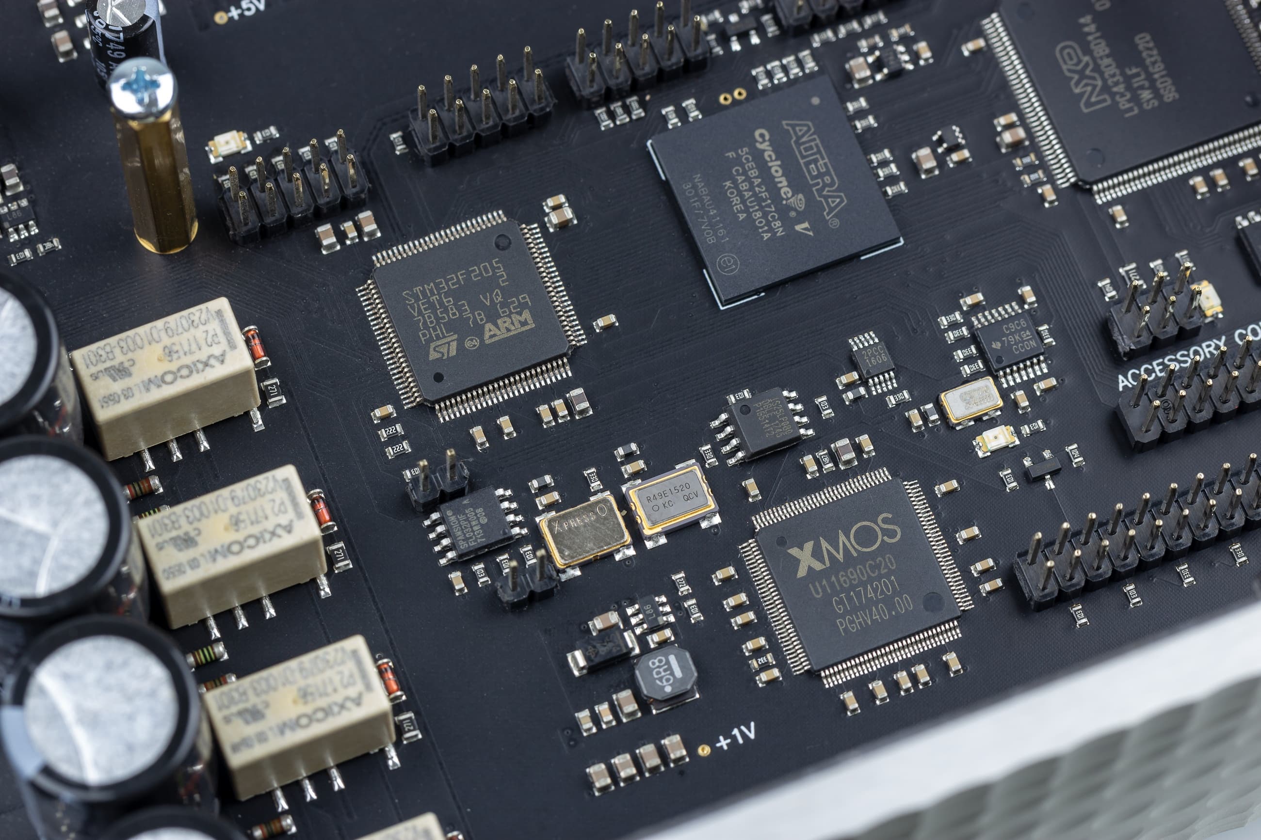 Цифровая часть устройства очень интересная. Здесь производитель собрал все возможные виды процессоров, которые можно увидеть в таких устройствах: XMOS XU216, SТM32, FPGA Altera Cyclon V и микроконтроллер NXP. Производитель не раскрывает подробностей о работе цифровой части. На наш взгляд, XMOS используется для USB и обмена с контрольной панелью карты в Windows и macOS X, STM32 — для управления с ИК-пульта ДУ и вывода информации на экранчик, Altera занимается формированием цифровых сигналов, а NXP может обслуживать опциональное Ethernet-подключение и стриминговые функции.