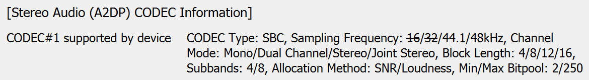 Полный список поддерживаемых кодеков и их режимов мы традиционно получили с помощью утилиты Bluetooth Tweaker. Кодек всего один — SBC. В целом, его возможностей для портативной акустики вполне достаточно. Но от продукта со столь пафосным описанием логично было бы ожидать поддержку ну хотя бы AAC, а в идеале — и aptX.