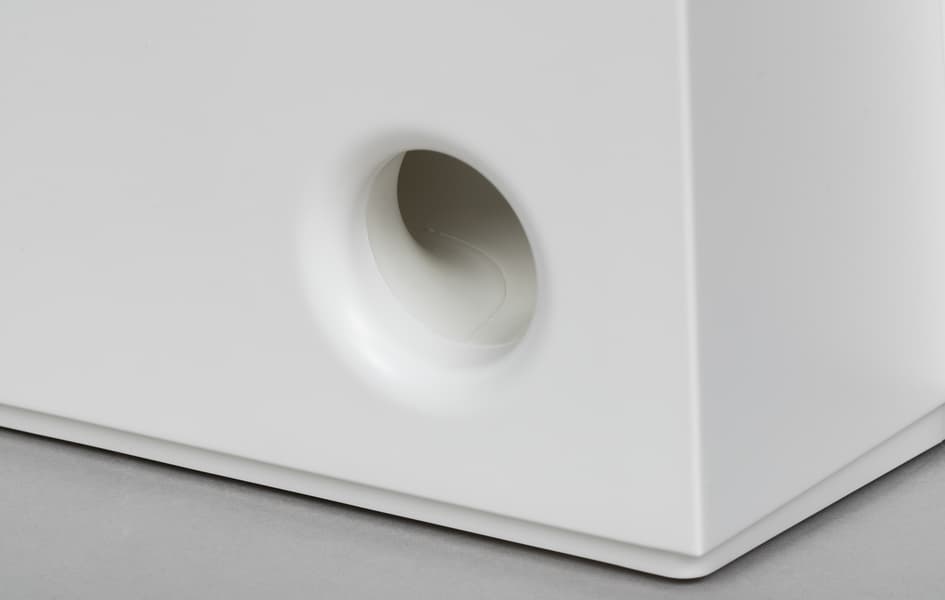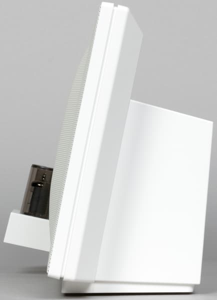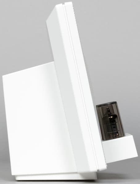 При взгляде сбоку хорошо заметно, что колонка чуть наклонена назад. Очень правильное решение, помогающее направить звук в сторону слушателя при размещении устройства ниже его головы — а именно так, скорее всего, оно и будет размещаться. В целом же ничего особо интересного на боковых панелях нет.