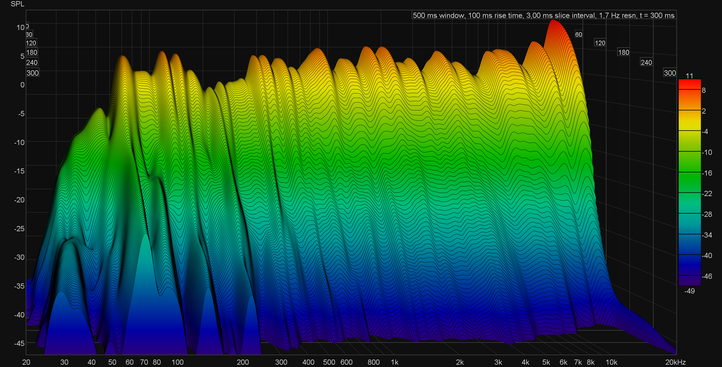 Низкочастотный диапазон при этом склонен к «гудению», в частности — на частоте настройки фазоинвертора, что хорошо видно на графике кумулятивного затухания спектра (он же «водопад» или waterfall). Тут уж ничего не поделаешь, корпус маленький и пластиковый — бороться разработчикам приходится не за качество баса, а сам факт его наличия.
