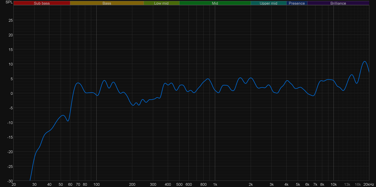 При всём обилии странных особенностей звучит Nakatomi OS-12 очень неплохо для своего форм-фактора. Даже как-то на удивление неплохо. «Глубокого баса», естественно, практически нет — ему просто неоткуда взяться, корпус слишком маленький. Однако низкочастотный диапазон при этом присутствует, на нем даже есть небольшой акцент. Средние частоты звучат вполне ровно и нейтрально, более того — хорошо читается и ВЧ-регистр. В общем, звук получается сбалансированный и без каких-либо раздражающих дефектов. Посмотрим на график АЧХ, полученный при размещении измерительного микрофона примерно в метре от акустики на оси динамиков, который отлично иллюстрирует всё сказанное выше.