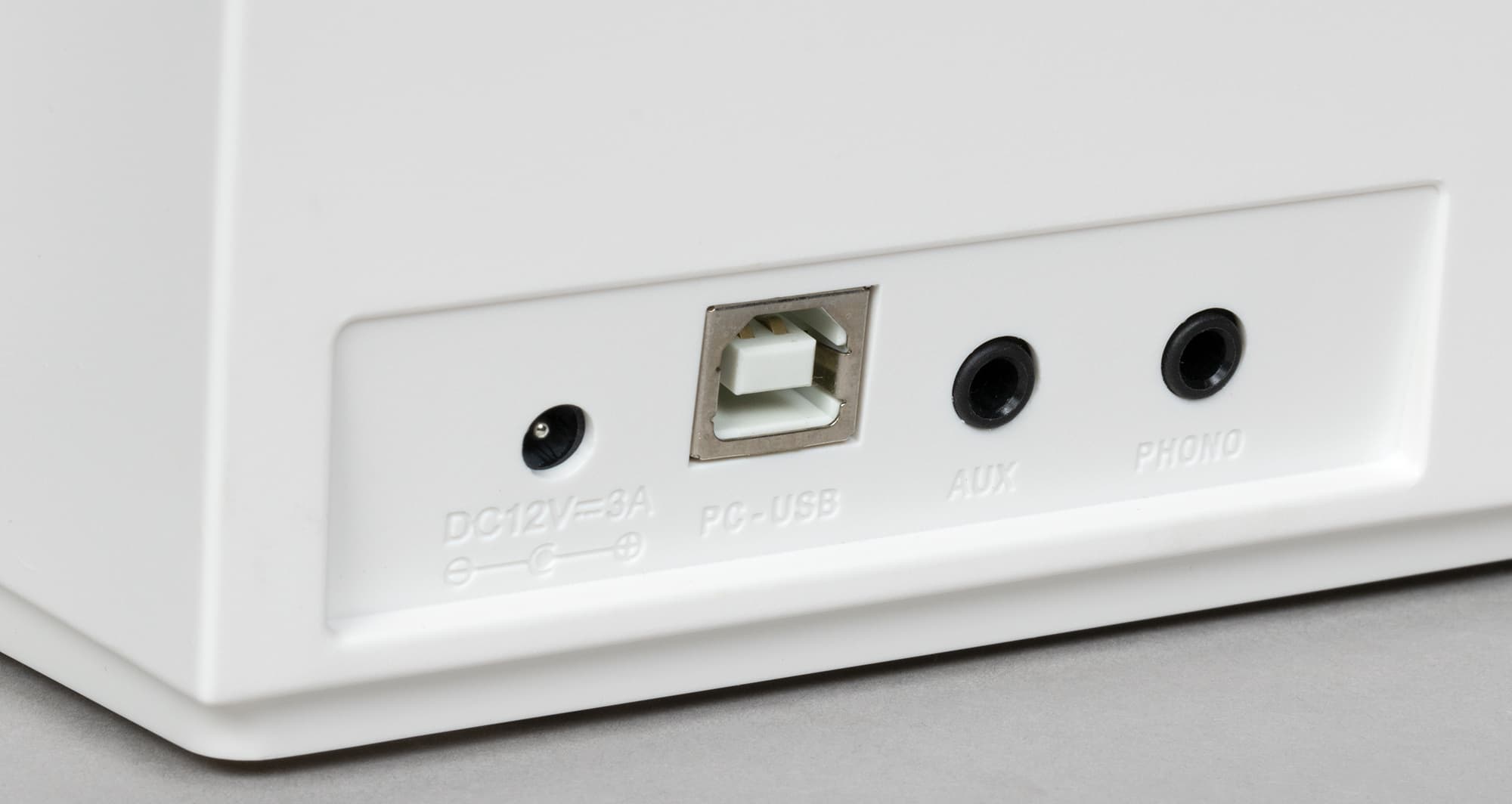Подготовить Nakatomi OS-12 к работе несложно. Для начала подключаем комплектный блок питания, далее определяемся с тем, как будем передавать на колонку звук. Тут у нас есть четыре варианта. Можно воспользоваться аналоговым подключением через разъем Aux — для этого даже специальный кабель есть в комплекте. Есть еще и специальный вход Phono для подключения винилового проигрывателя, но он, мягко говоря, странный.