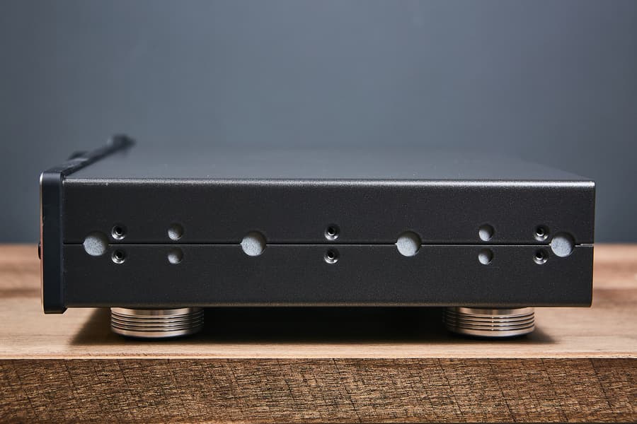 Выглядит устройство крайне солидно, корпус выполнен из окрашенного в черный цвет металла, передняя панель, как уже упоминалось — из 10-миллиметрового анодированного алюминия.