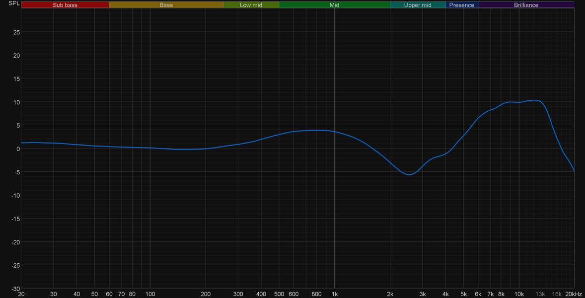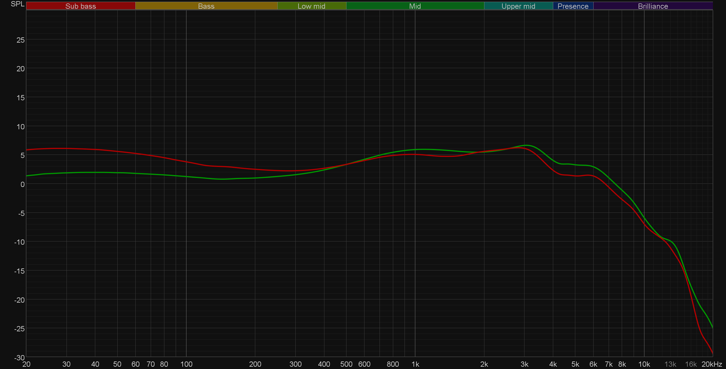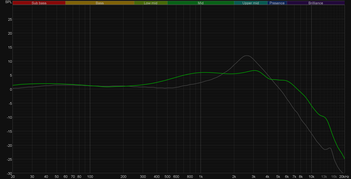 График АЧХ выше показан на фоне кривой IDF (IEM diffuse field compensation), предоставленной производителем используемого стенда. Ее задача — помочь скомпенсировать резонансные явления в имитированном слуховом канале и особенности используемого оборудования, создав «звуковой профиль», максимально корректно иллюстрирующий то, как звучание наушников воспринимается слушателем. Ее можно рассматривать как адаптированный под конкретное устройство аналог так называемой «кривой Хармана», созданной командой Harman International под руководством доктора Шона Олива.