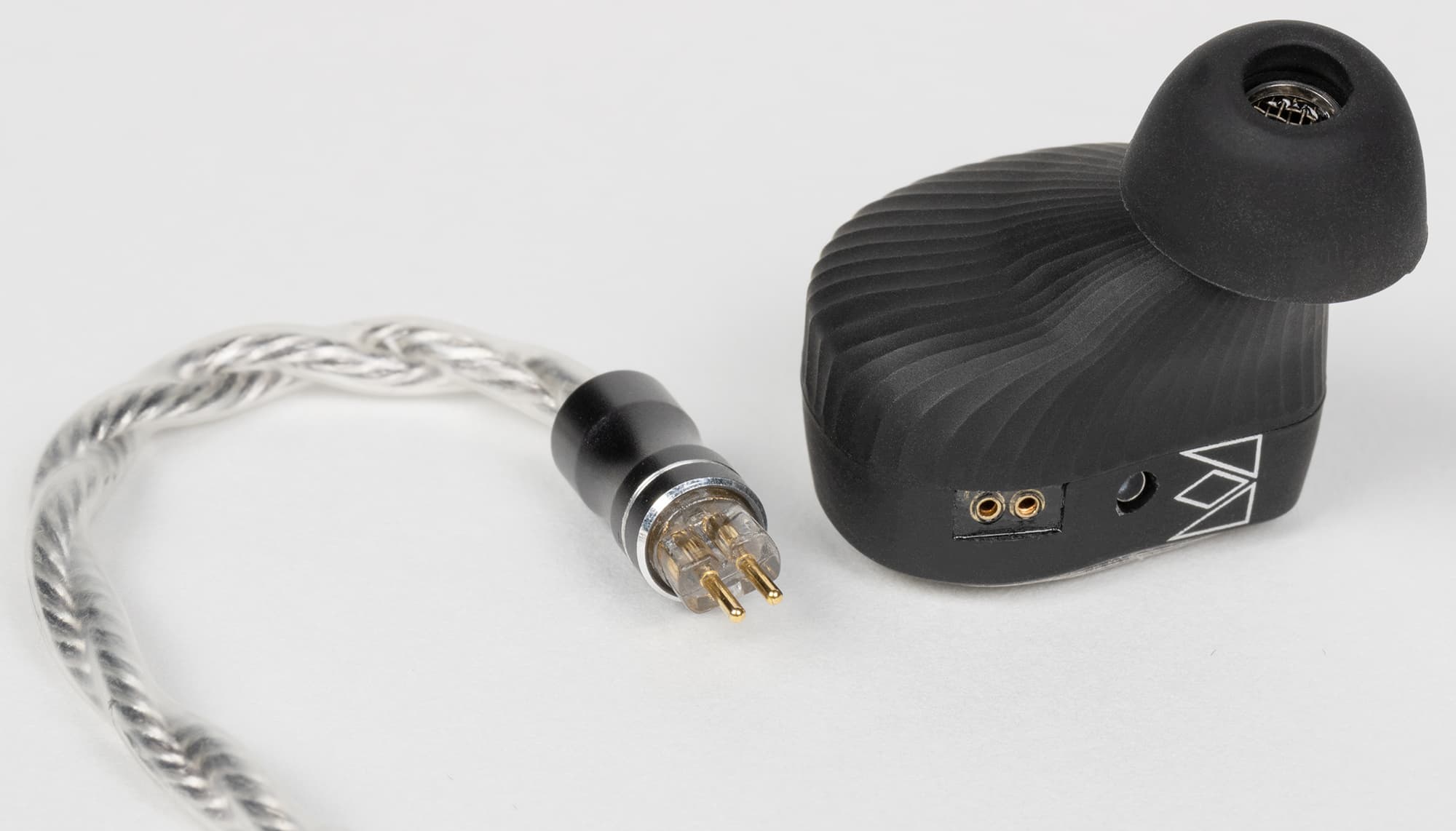 На обращенной вниз при ношении наушников боковой стороне корпуса мы видим 2-контактный разъем для подключения кабеля и логотип производителя.
