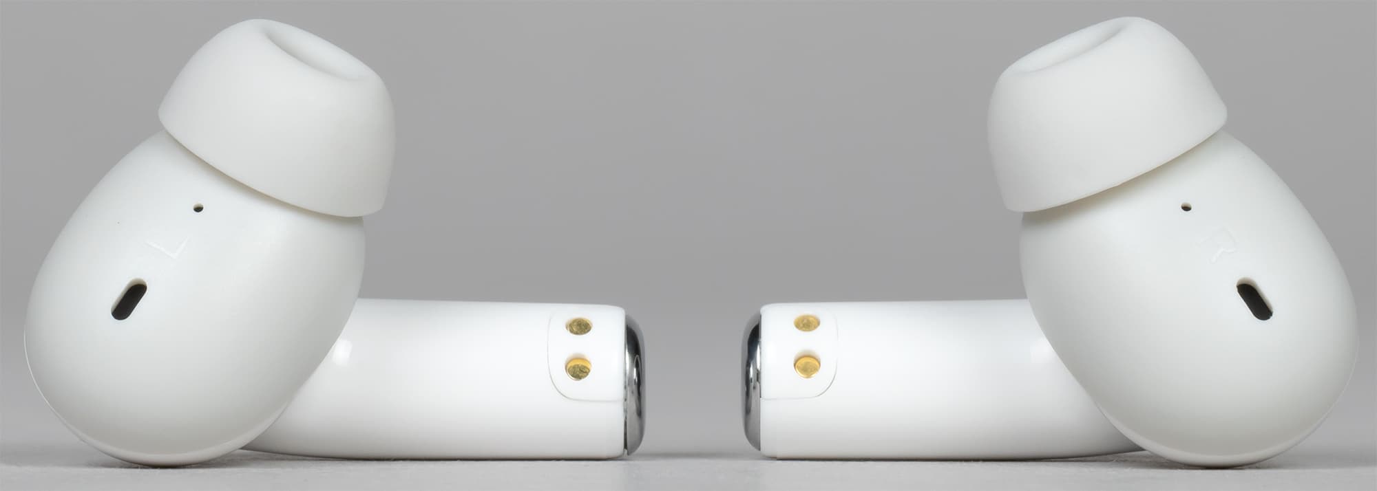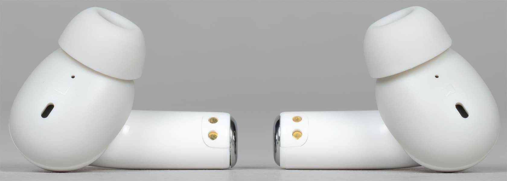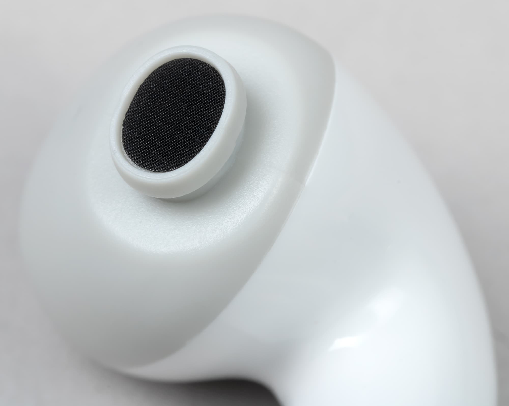 На внешнюю сторону корпуса нанесен логотип, выше него находится небольшой выступ — маркер сенсорной зоны, еще выше — отверстие второго микрофона, используемого для работы функции «звуковой прозрачности».