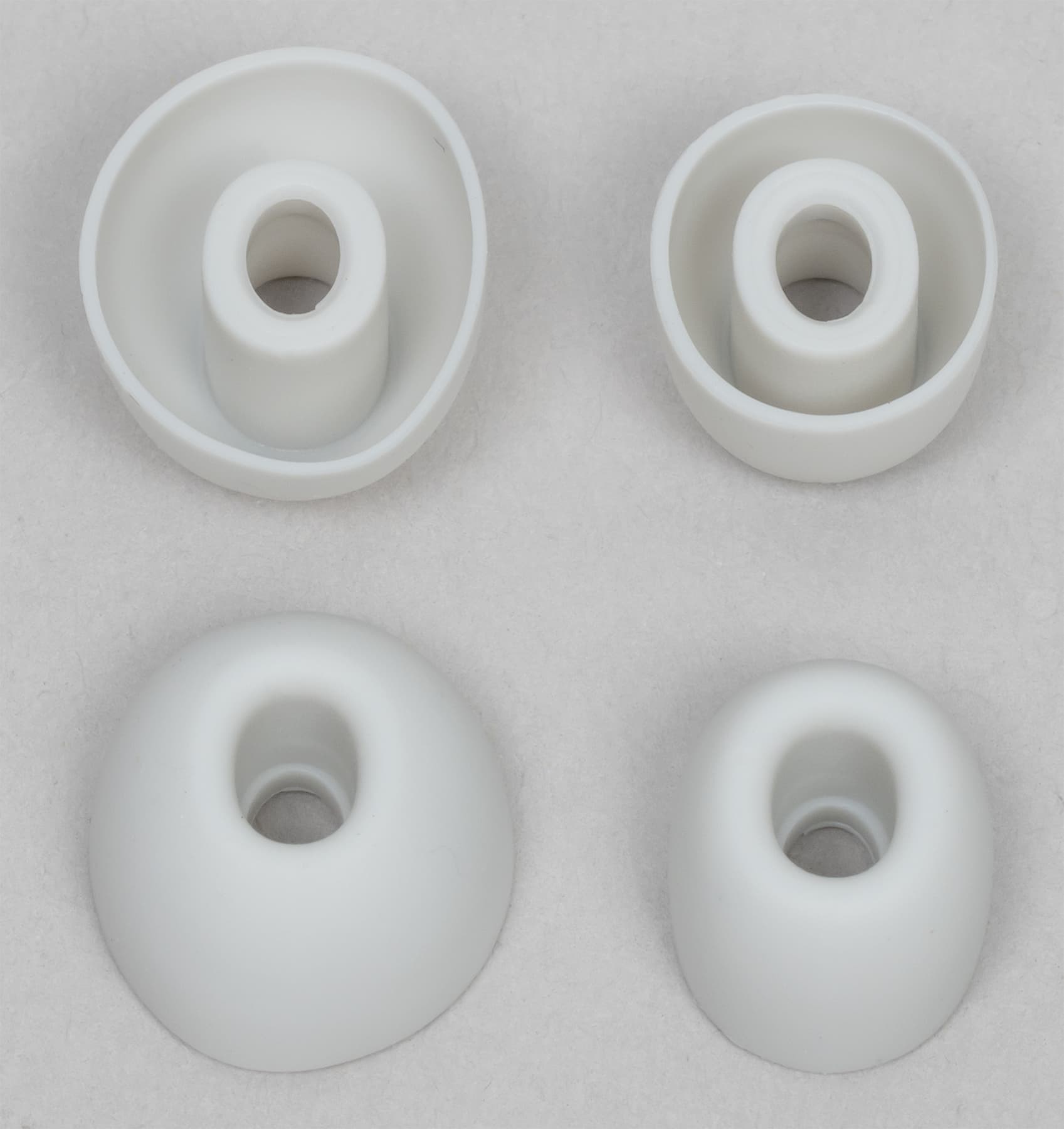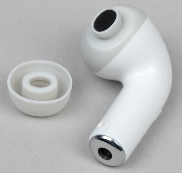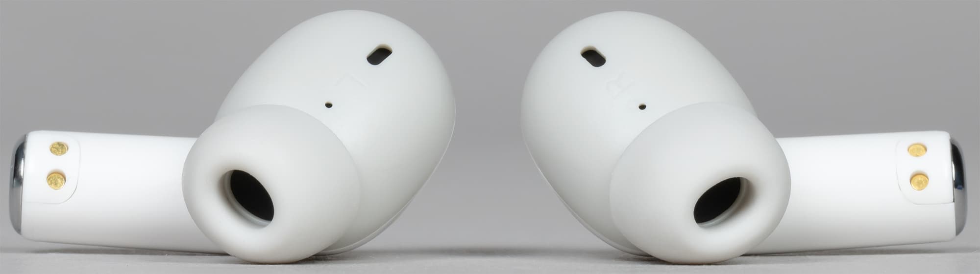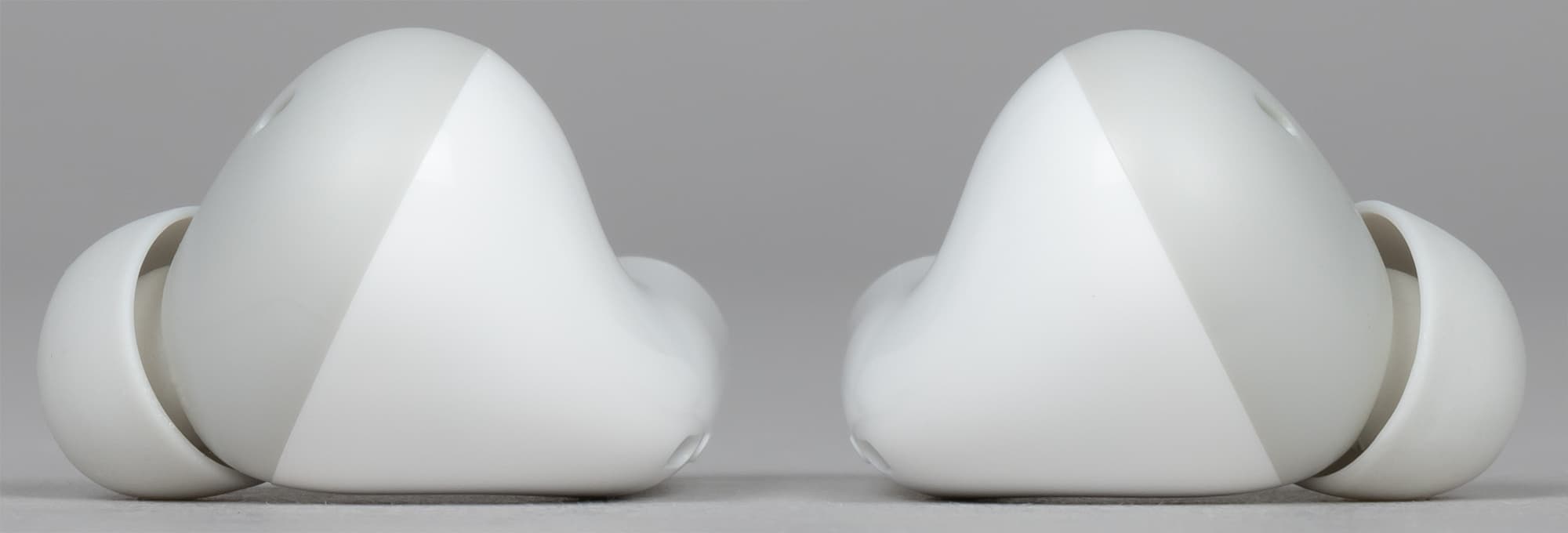 На внешнюю сторону корпуса нанесен логотип, выше него находится небольшой выступ — маркер сенсорной зоны, еще выше — отверстие второго микрофона, используемого для работы функции «звуковой прозрачности».