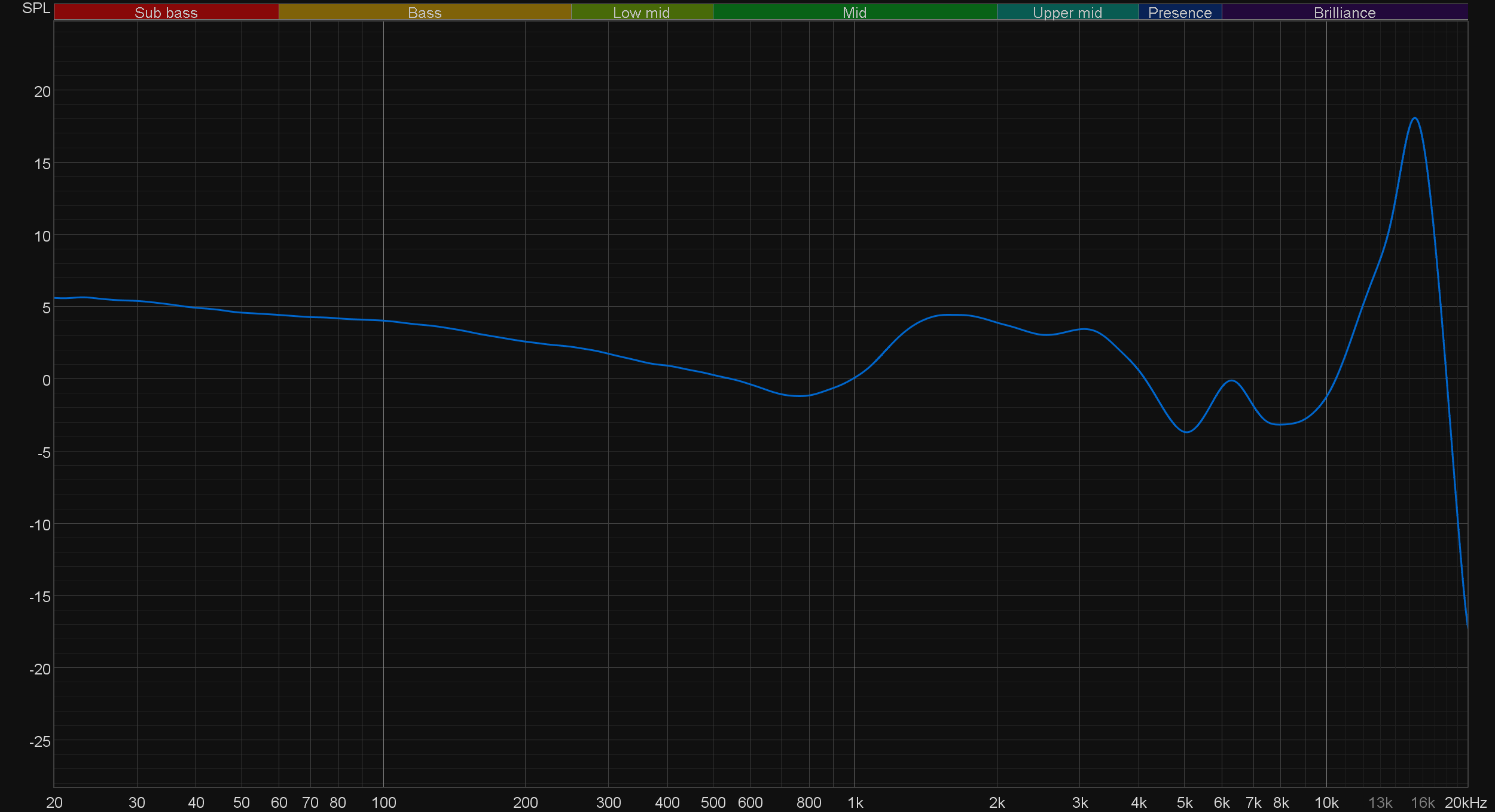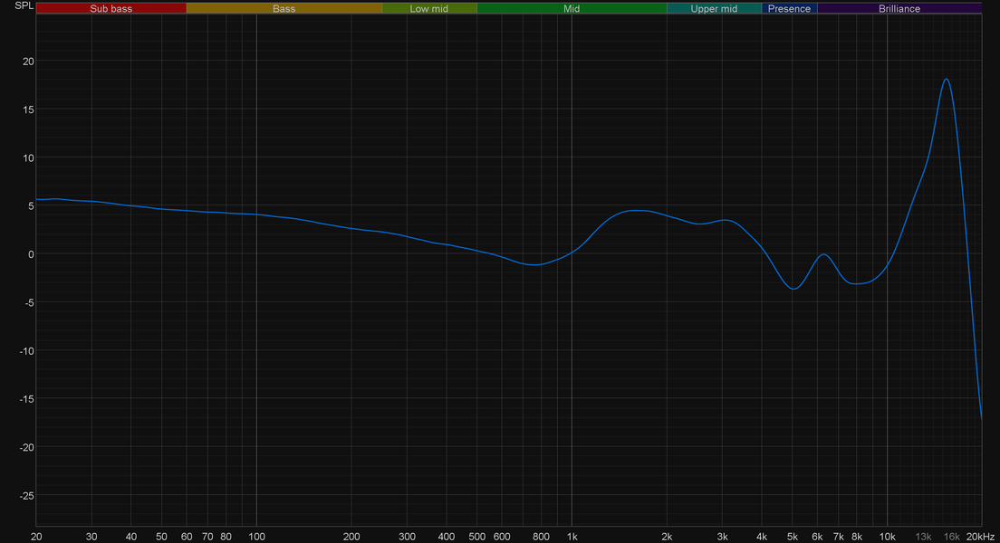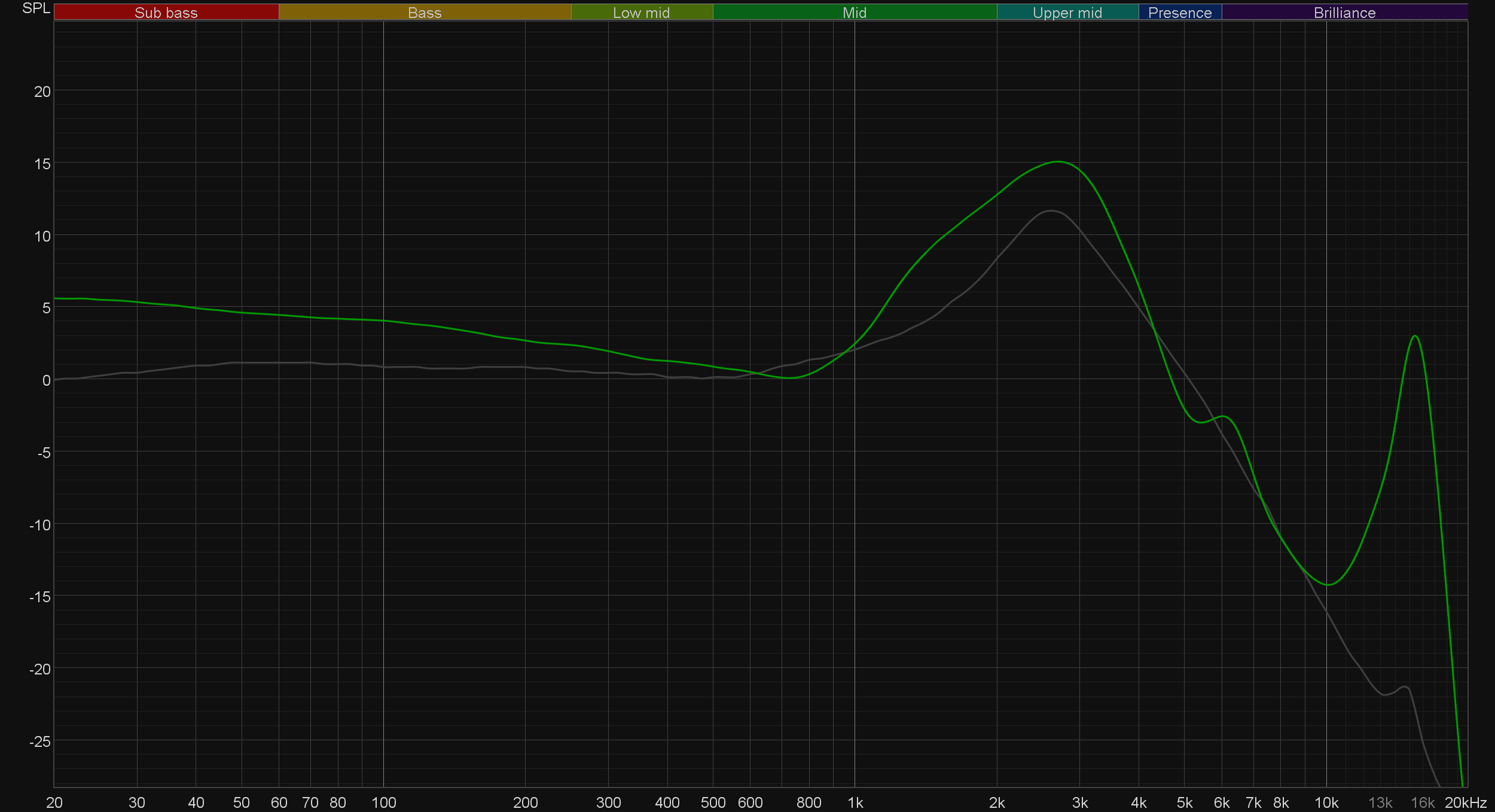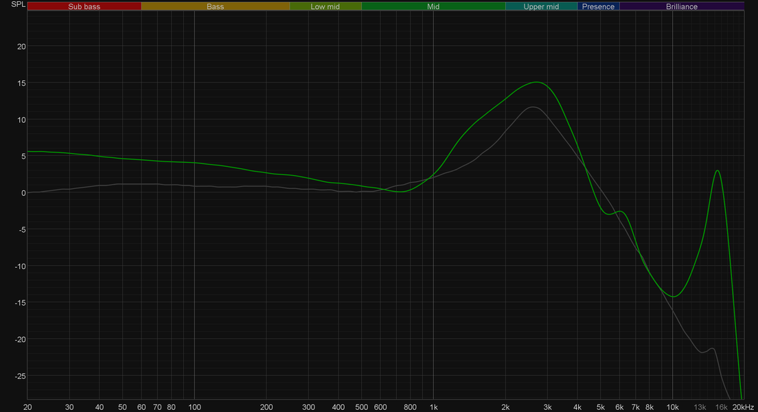 График АЧХ выше показан на фоне кривой IDF (IEM diffuse field compensation), предоставленной производителем используемого стенда. Ее задача — помочь скомпенсировать резонансные явления в имитированном слуховом канале и особенности используемого оборудования, создав «звуковой профиль», максимально корректно иллюстрирующий то, как звучание наушников воспринимается слушателем. Ее можно рассматривать как адаптированный под конкретное устройство аналог так называемой «кривой Хармана», созданной командой Harman International под руководством доктора Шона Олива. Скомпенсируем полученный график АЧХ в соответствии с кривой IDF.