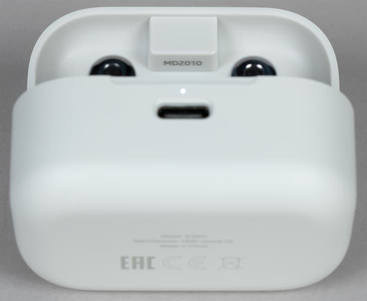 Извлечь наушники при этом довольно просто — достаточно сдвинуть в бок их «палочку», либо потянуть корпус на себя. Во время зарядки становится заметен светодиодный индикатор, расположенный довольно глубоко внутри отверстия на внешней стороне наушников.