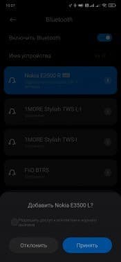 После извлечения из кейса наушники некоторое время пытаются подключиться к уже «знакомому» источнику, если не находят его — активируют режим сопряжения. Каждый из наушников подключается как отдельное устройство — сначала приходит запрос на сопряжение с первым, а потом — и со вторым.