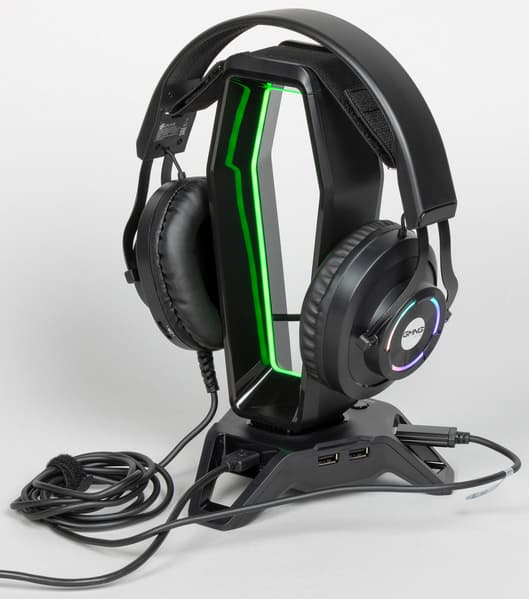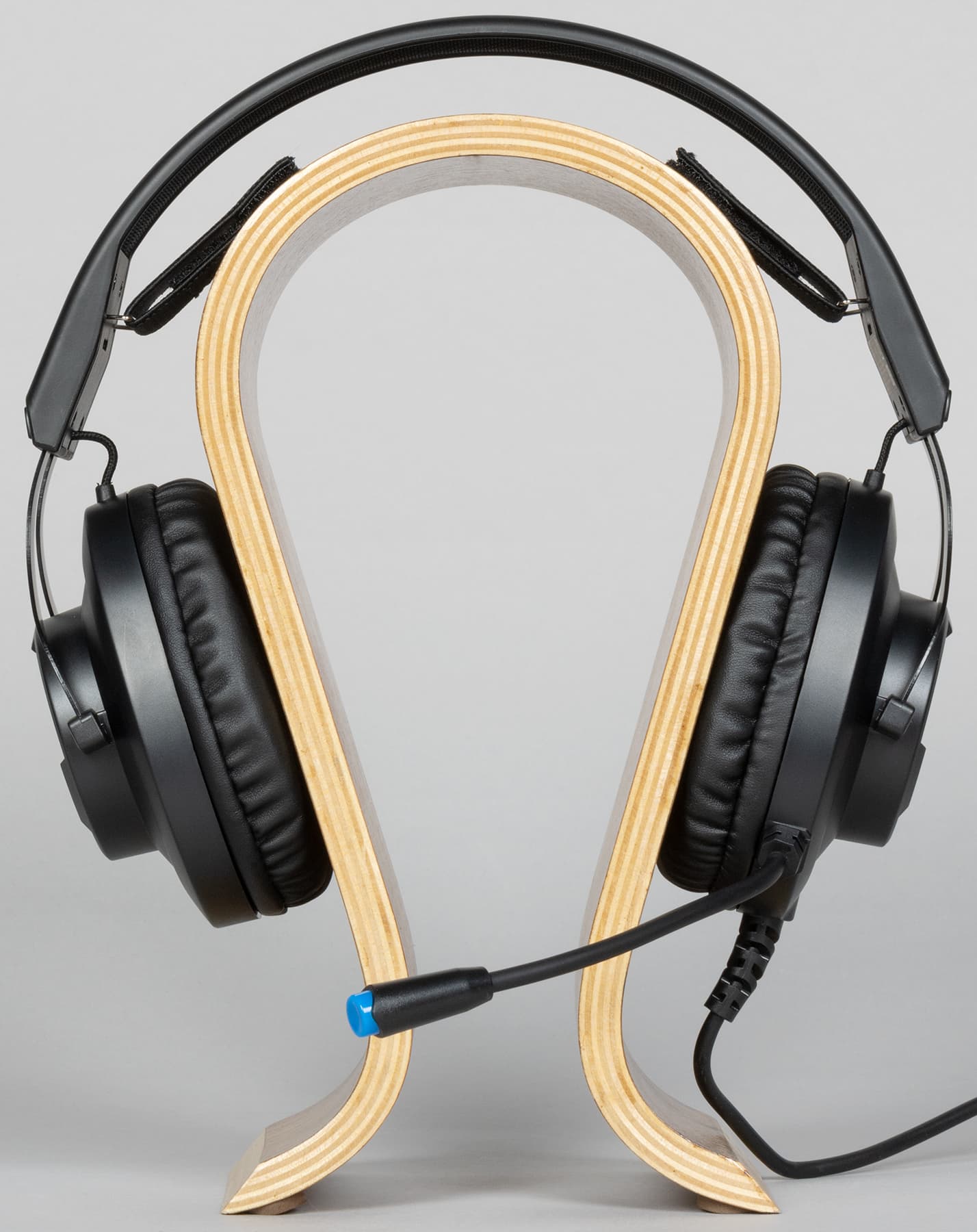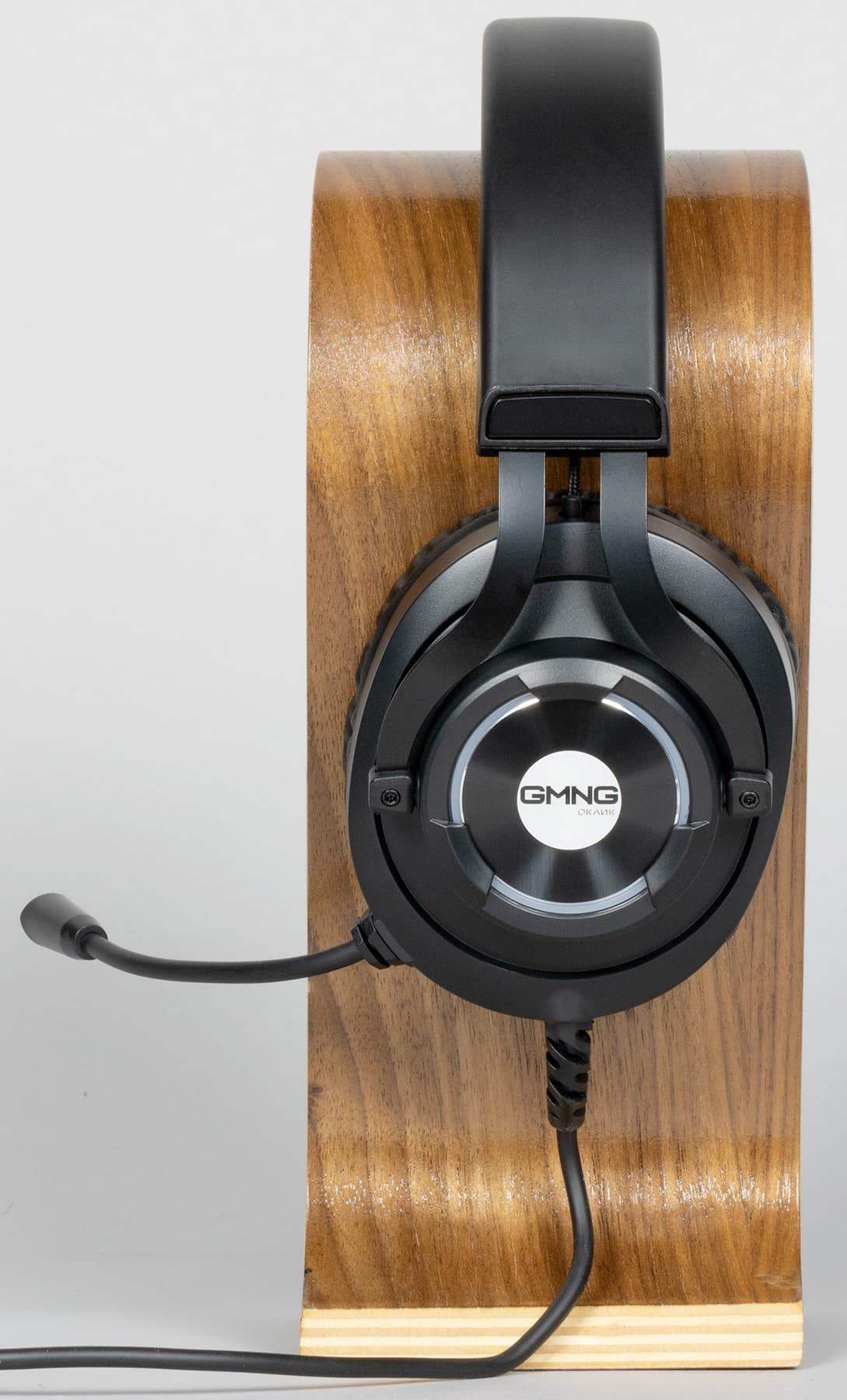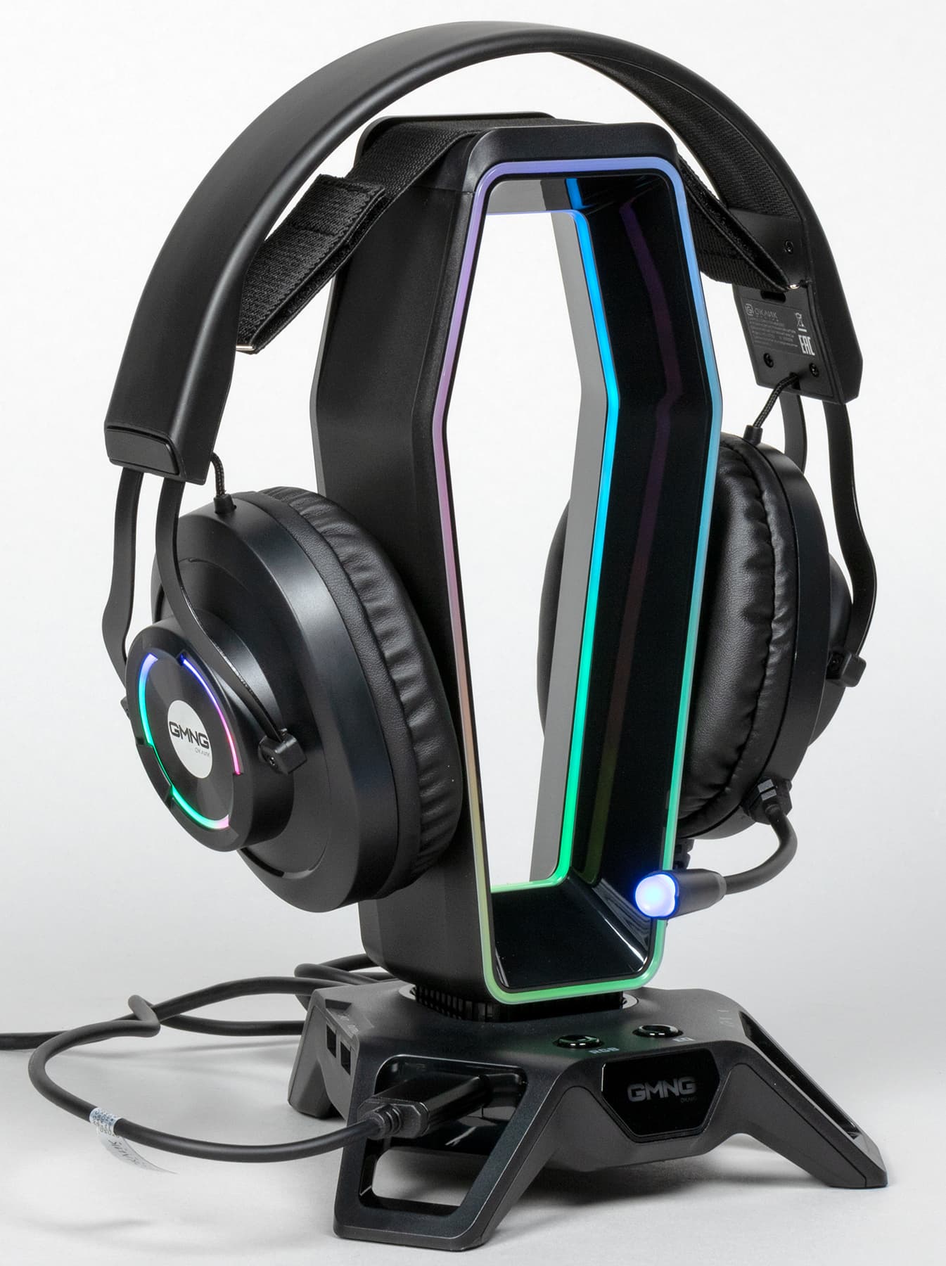 Гарнитура приехала к нам на тестирование в компании подставки для наушников GMNG HSS-502, с которой она хорошо сочетается по дизайну. Изначально мы планировали подготовить про них общий обзор, но в ходе тестирования выяснилось, что о подставке можно рассказать довольно много интересного, поэтому про нее мы уже выпустили отдельную статью. А вот так тестируемые наушники выглядят на стенде того же бренда.