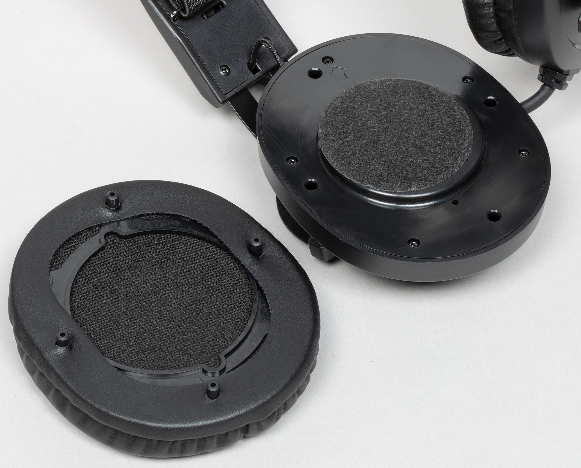 Снимаются амбушюры вместе с удерживающим их пластиковым кольцом. Отверстие динамика дополнительно прикрыто круглым кусочком ткани. Наклеен он не очень ровно, перфекционисты негодуют — но на эксплуатационные свойства, да и на внешний вид устройства это никак не влияет.