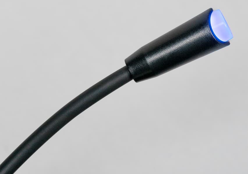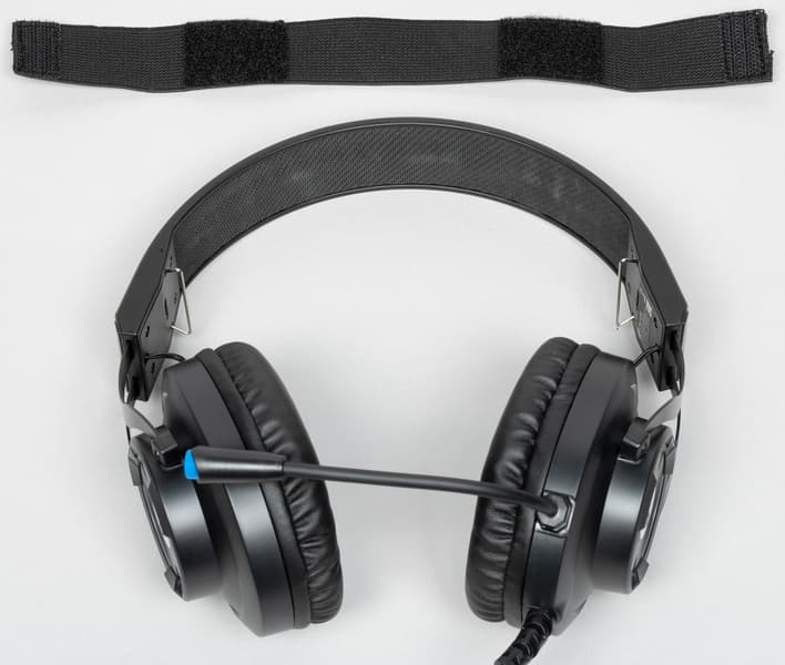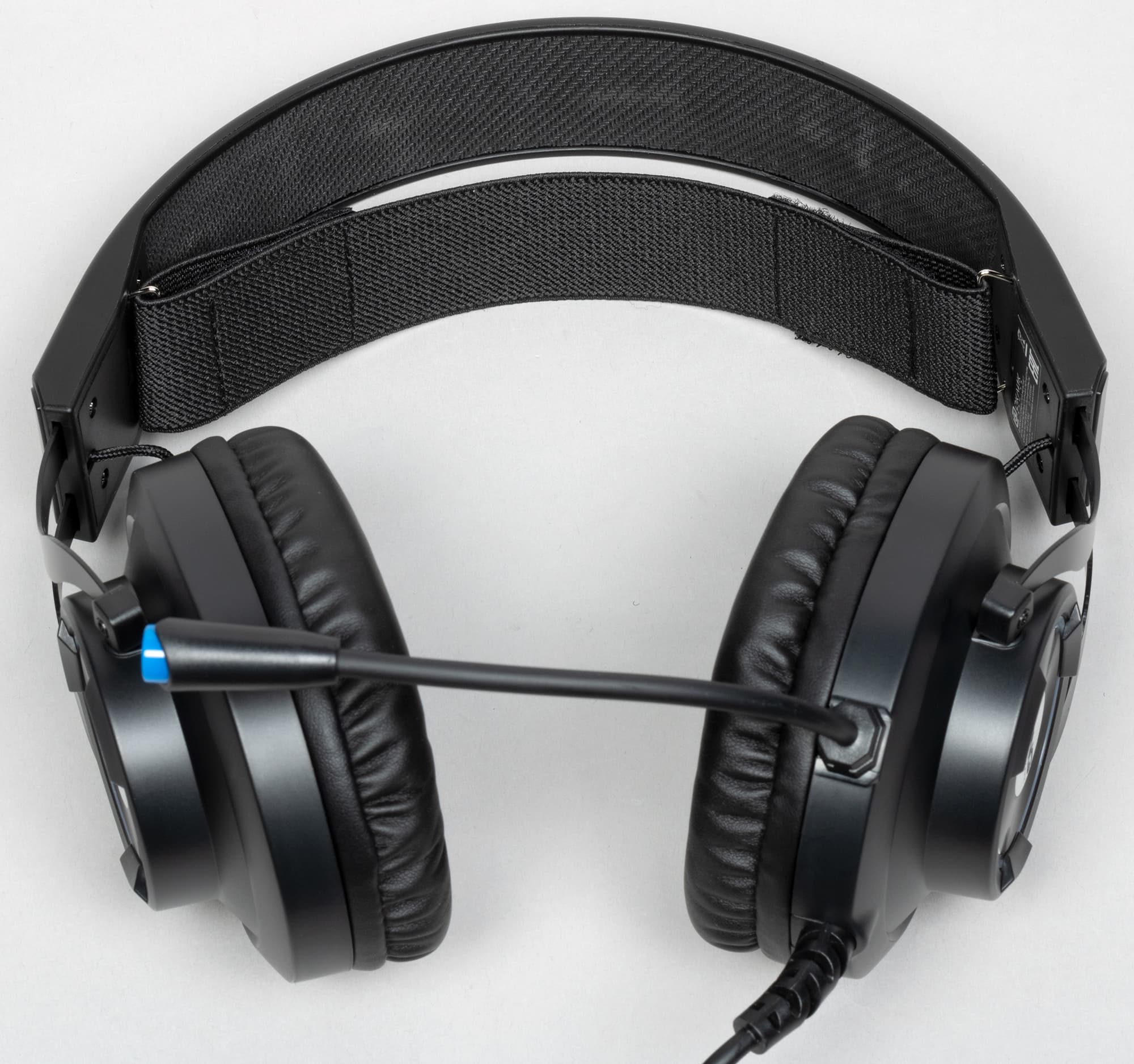 На левой чашке размещен микрофон с гибкой ножкой общей длиной 13 см, также оснащенный подсветкой.